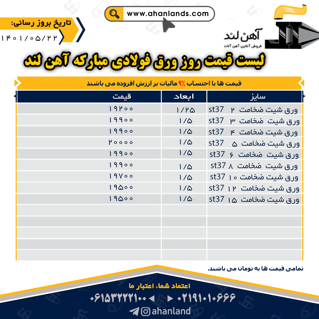 لیست قیمت بیست و دوم مرداد ۱۴۰۱ برای مشاهده آنلاین قیمت انواع مقاطع فولادی به وب سایت زیر مراجعه نمایید: WWW.AHANLANDS.COM ⚜اعتماد شما اعتبار ماست⚜ ارتباط با کارشناسان ما: https://zil.ink/ahanland 📍آدرس اینستاگرام آهن لند https://lnkd.in/d۴epHFt