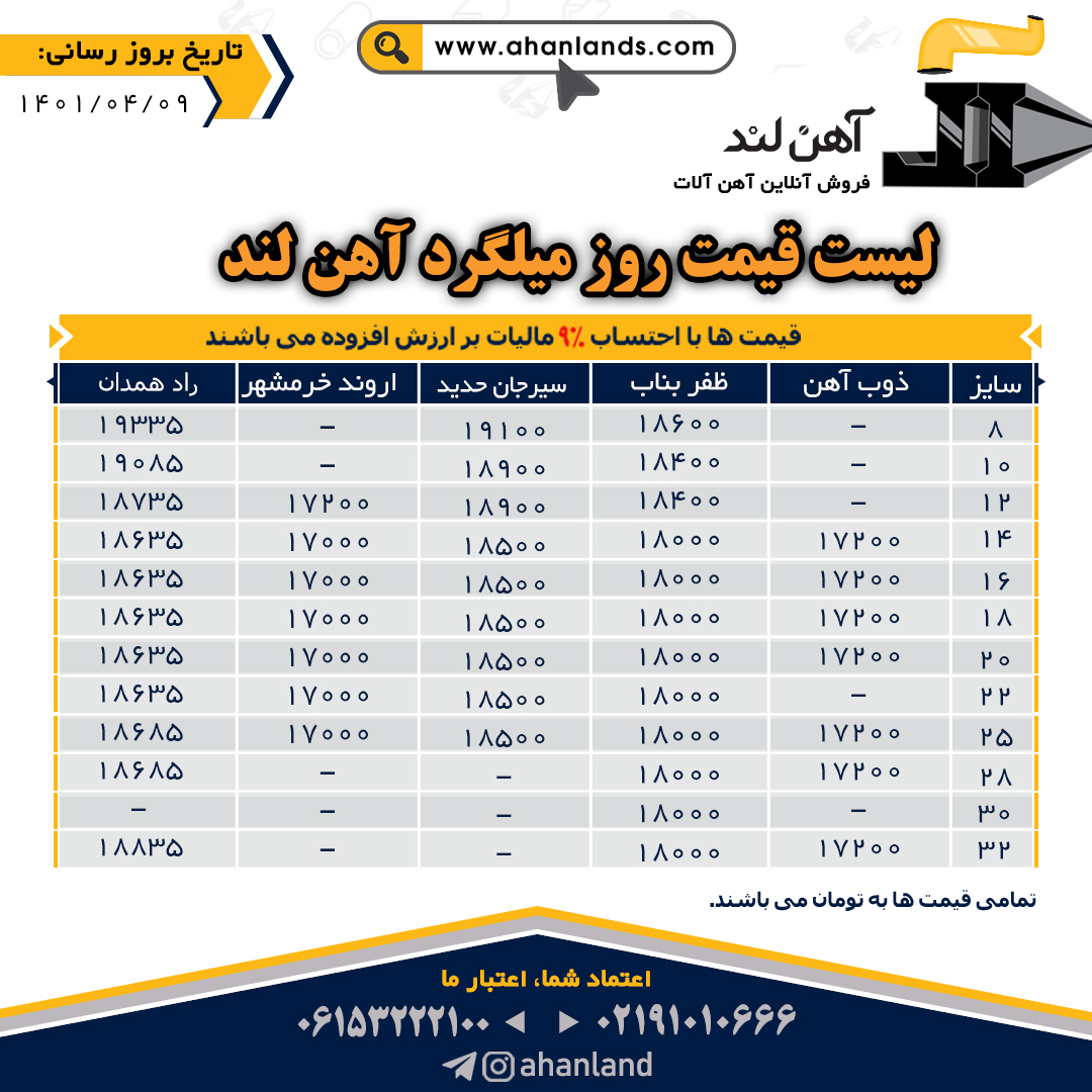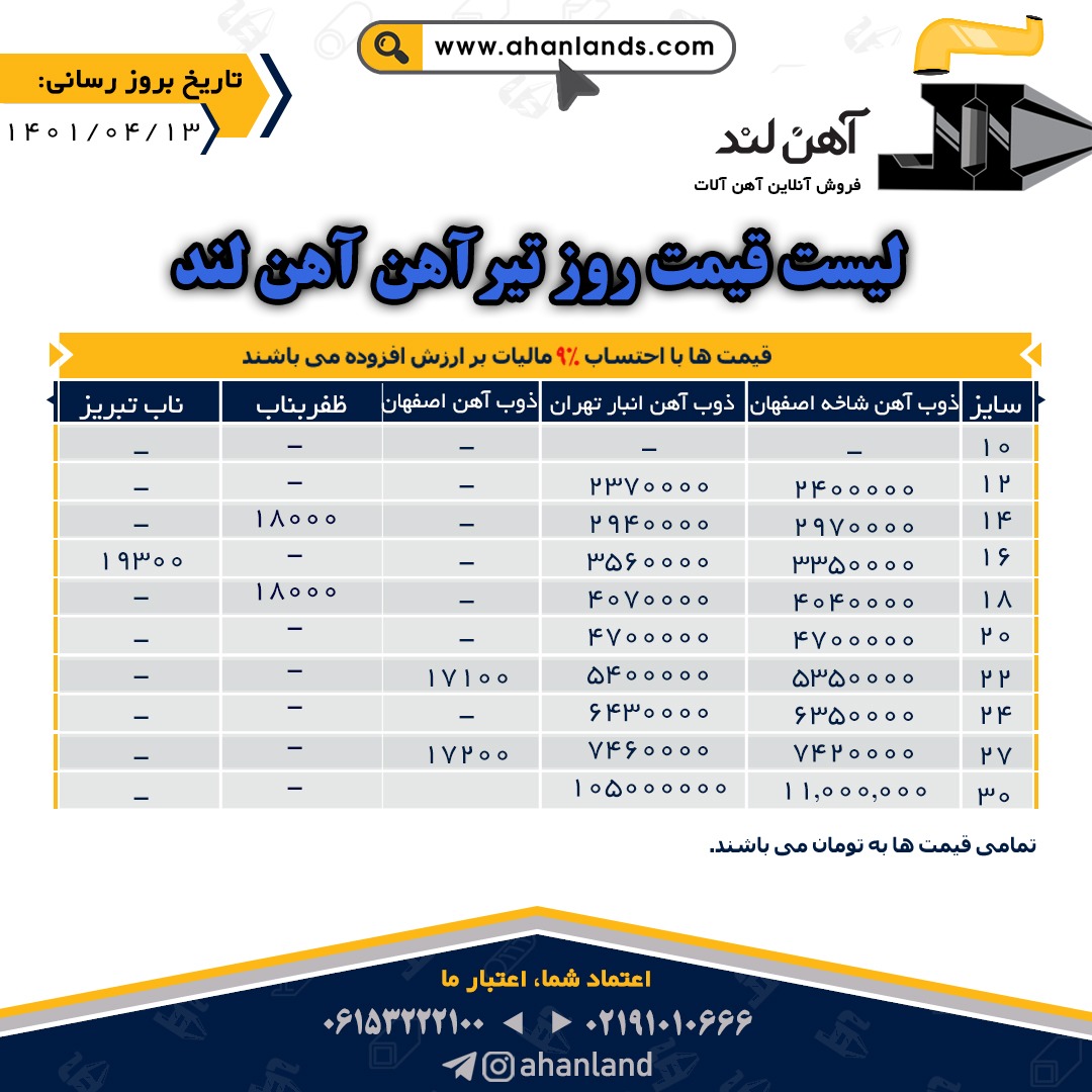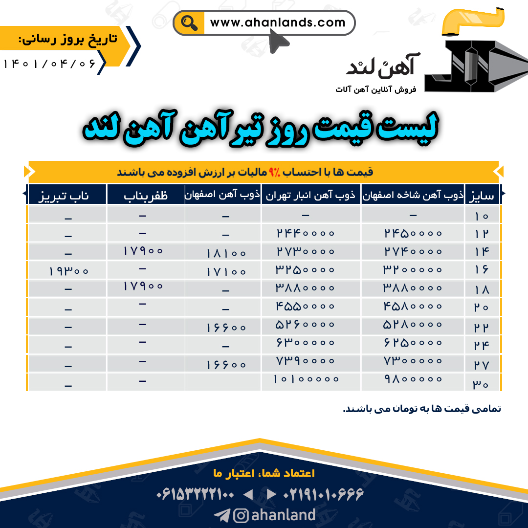 لیست قیمت سیزدهم تیر ۱۴۰۱ برای مشاهده آنلاین قیمت انواع مقاطع فولادی به وب سایت زیر مراجعه نمایید: WWW.AHANLANDS.COM ⚜اعتماد شما اعتبار ماست⚜ ارتباط با کارشناسان ما: https://zil.ink/ahanland 📍آدرس اینستاگرام آهن لند https://lnkd.in/d۴epHFt