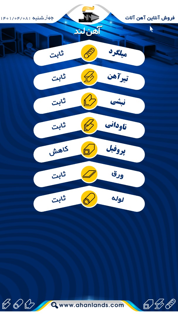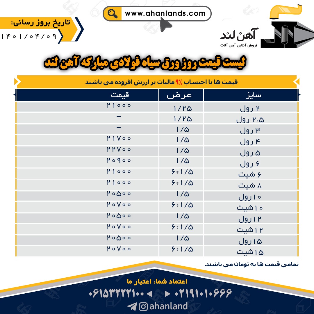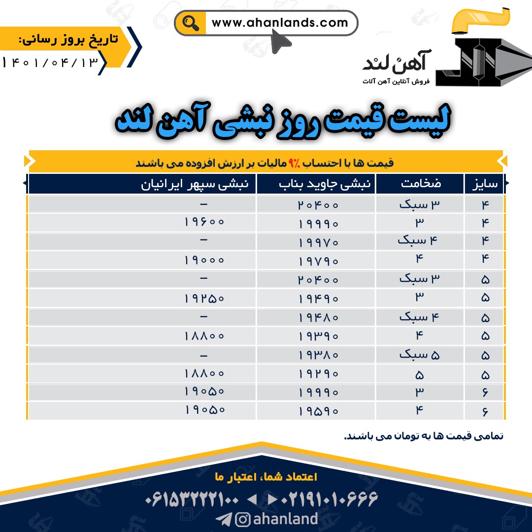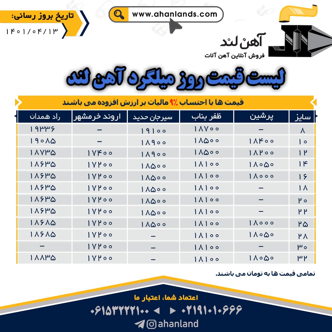 لیست قیمت سیزدهم تیر ۱۴۰۱ برای مشاهده آنلاین قیمت انواع مقاطع فولادی به وب سایت زیر مراجعه نمایید: WWW.AHANLANDS.COM ⚜اعتماد شما اعتبار ماست⚜ ارتباط با کارشناسان ما: https://zil.ink/ahanland 📍آدرس اینستاگرام آهن لند https://lnkd.in/d۴epHFt