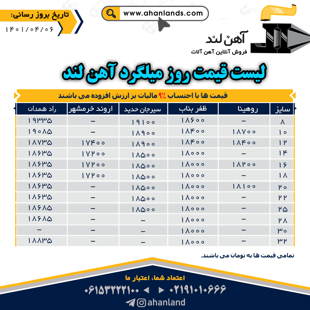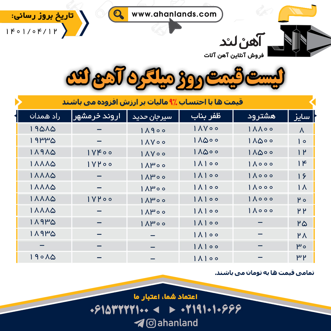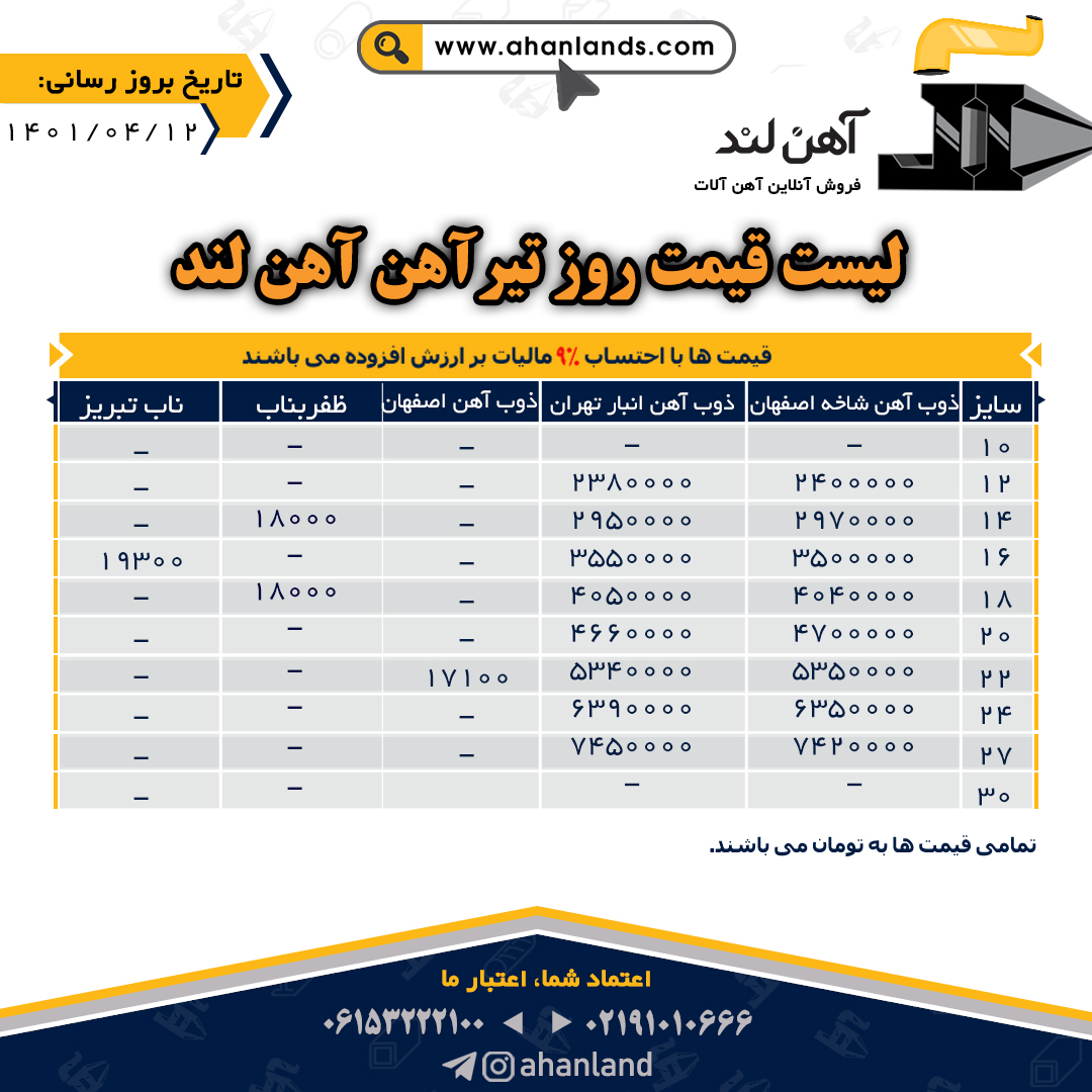 لیست قیمت دوازدهم تیر ۱۴۰۱ برای مشاهده آنلاین قیمت انواع مقاطع فولادی به وب سایت زیر مراجعه نمایید: WWW.AHANLANDS.COM ⚜اعتماد شما اعتبار ماست⚜ ارتباط با کارشناسان ما: https://zil.ink/ahanland 📍آدرس اینستاگرام آهن لند https://lnkd.in/d۴epHFt
