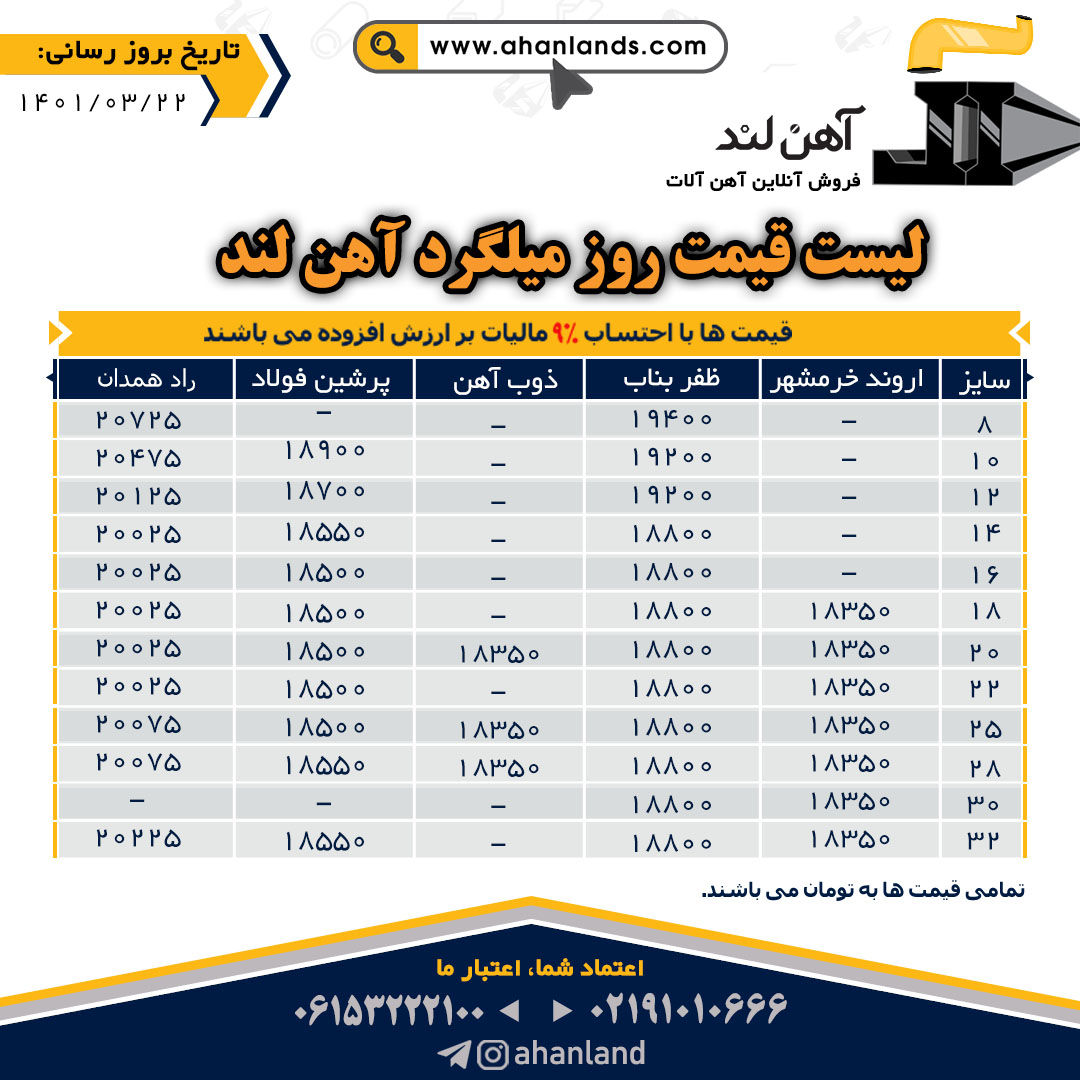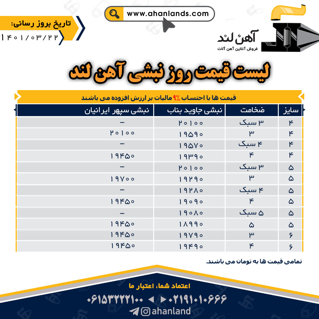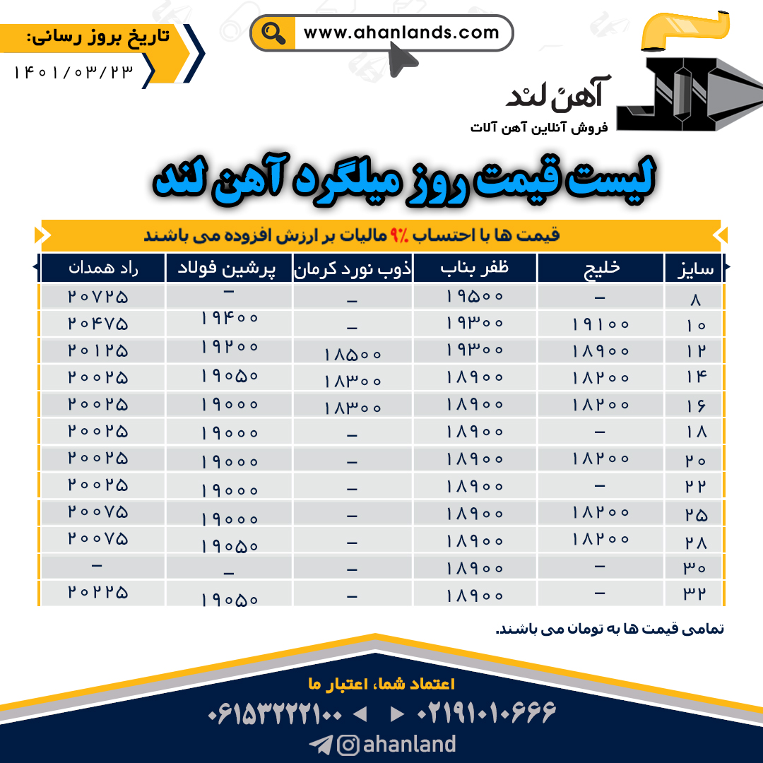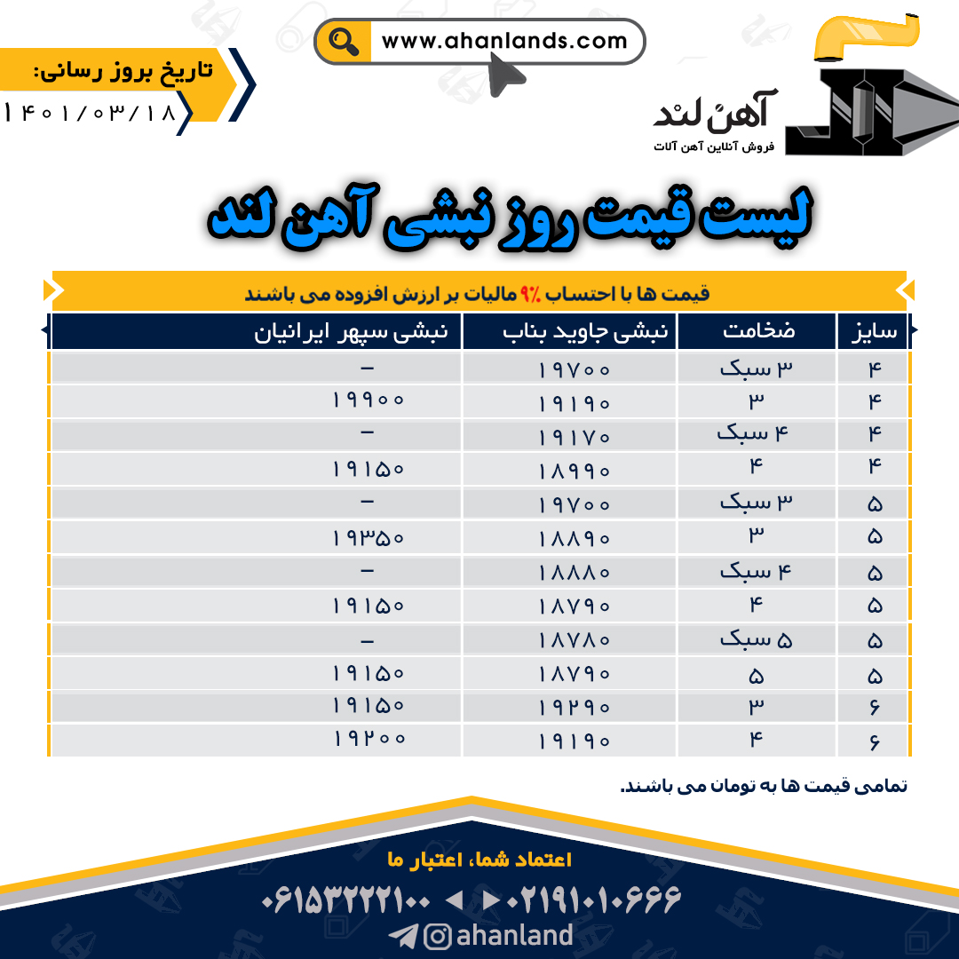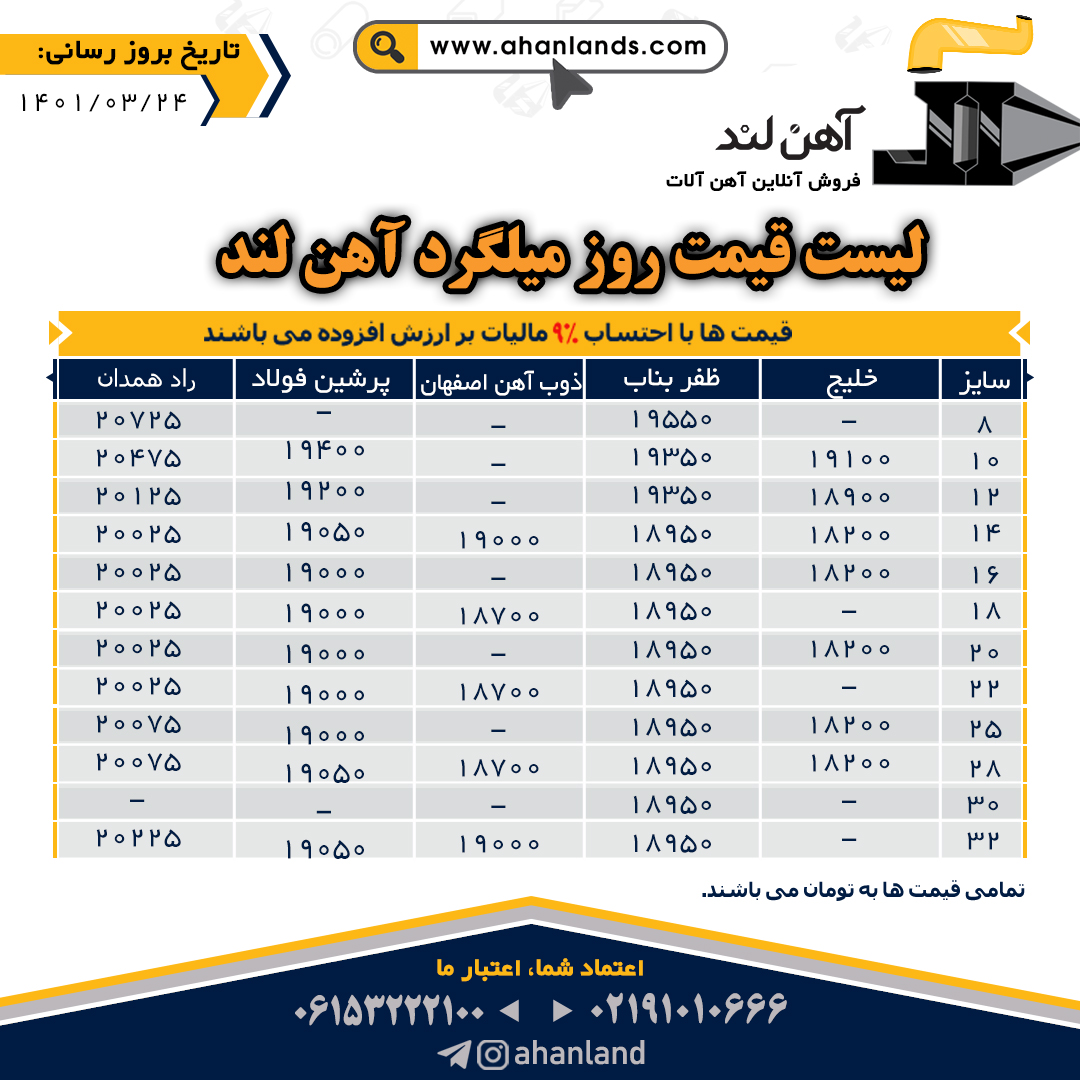 لیست قیمت بیست و چهارم خرداد ۱۴۰۱ برای مشاهده آنلاین قیمت انواع مقاطع فولادی به وب سایت زیر مراجعه نمایید: WWW.AHANLANDS.COM ⚜اعتماد شما اعتبار ماست⚜ ارتباط با کارشناسان ما: https://zil.ink/ahanland 📍آدرس اینستاگرام آهن لند https://lnkd.in/d۴epHFt