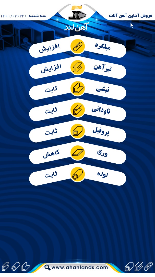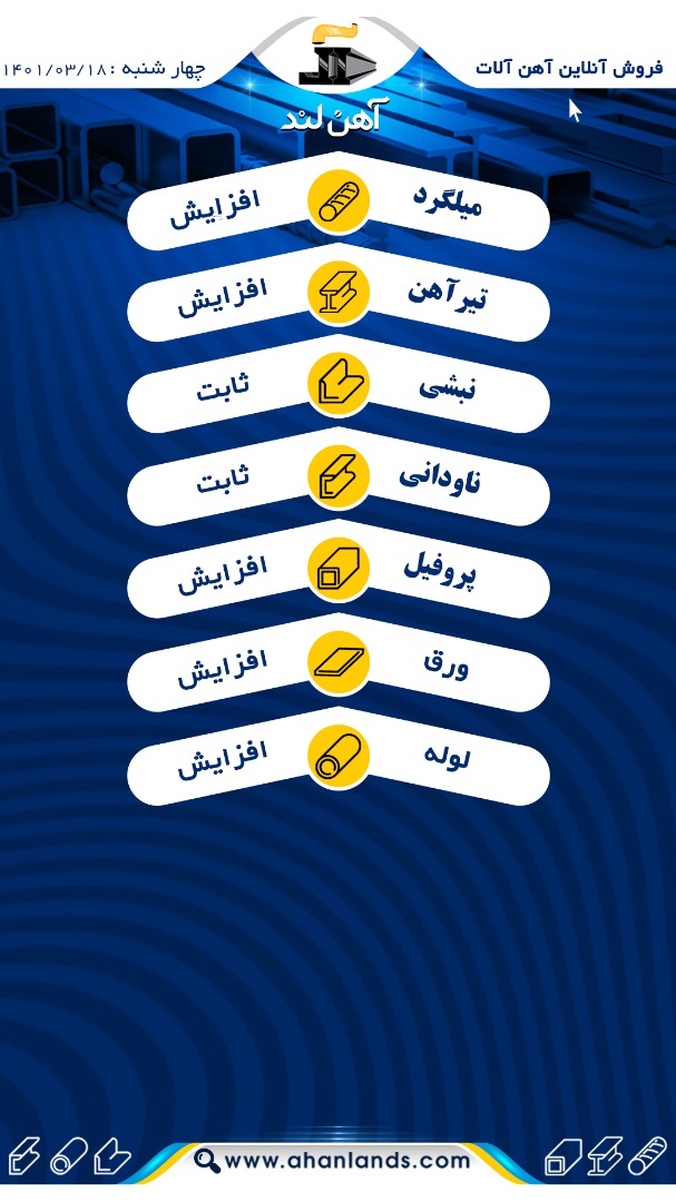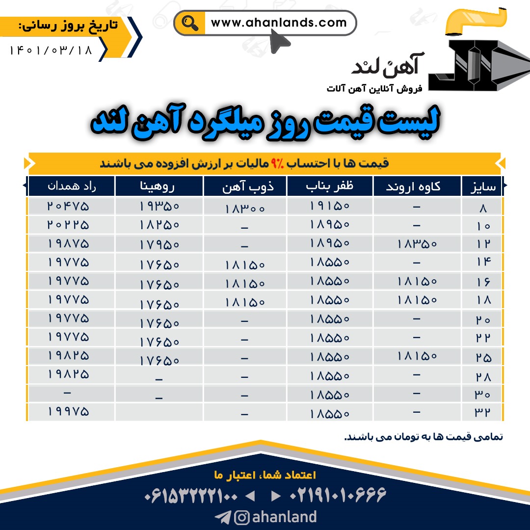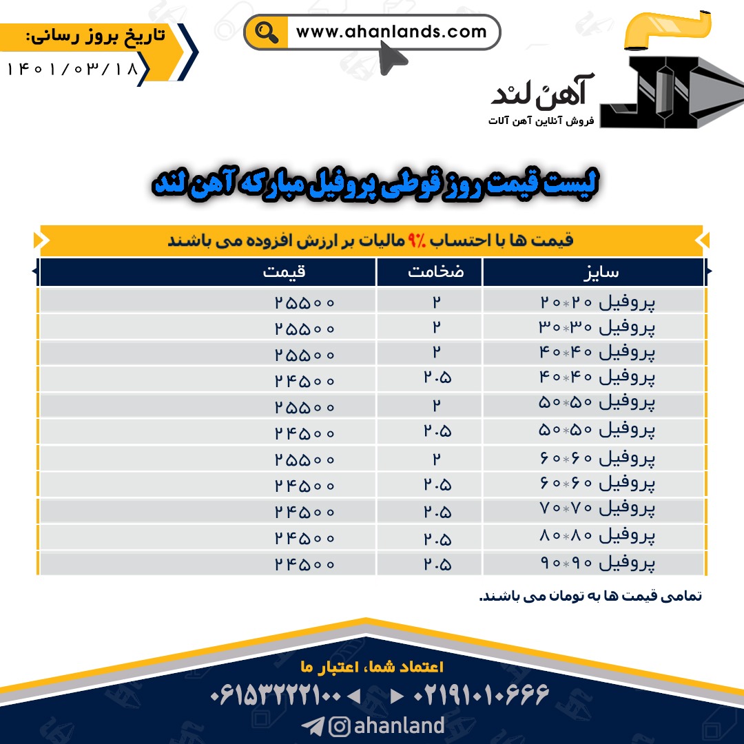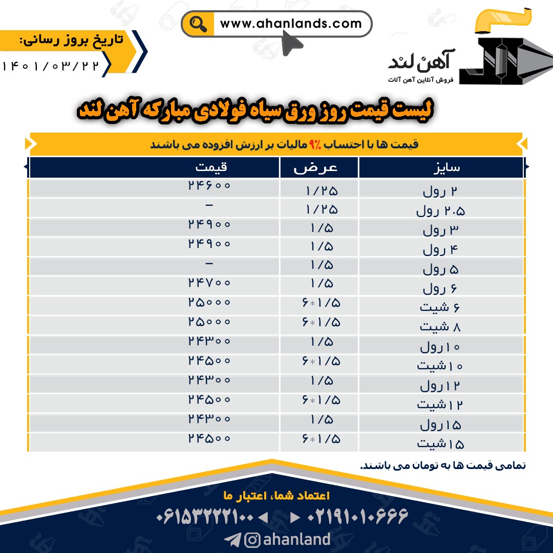 لیست قیمت بیست و چهارم خرداد ۱۴۰۱ برای مشاهده آنلاین قیمت انواع مقاطع فولادی به وب سایت زیر مراجعه نمایید: WWW.AHANLANDS.COM ⚜اعتماد شما اعتبار ماست⚜ ارتباط با کارشناسان ما: https://zil.ink/ahanland 📍آدرس اینستاگرام آهن لند https://lnkd.in/d۴epHFt
