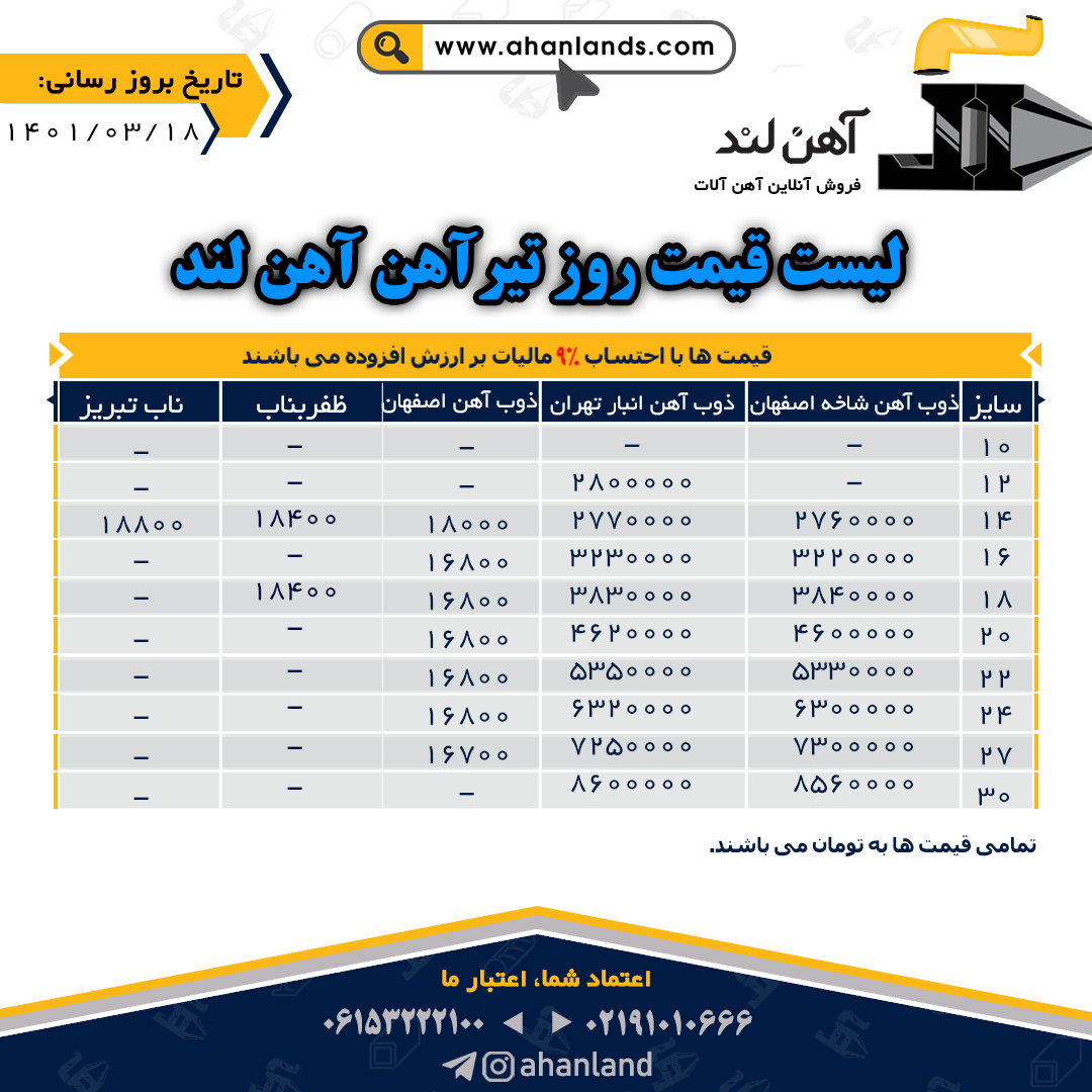 لیست قیمت هجدهم خرداد ۱۴۰۱ برای مشاهده آنلاین قیمت انواع مقاطع فولادی به وب سایت زیر مراجعه نمایید: WWW.AHANLANDS.COM ⚜اعتماد شما اعتبار ماست⚜ ارتباط با کارشناسان ما: https://zil.ink/ahanland 📍آدرس اینستاگرام آهن لند https://lnkd.in/d۴epHFt