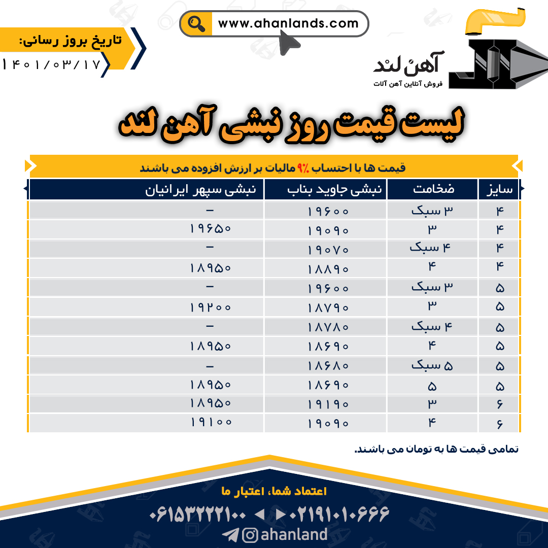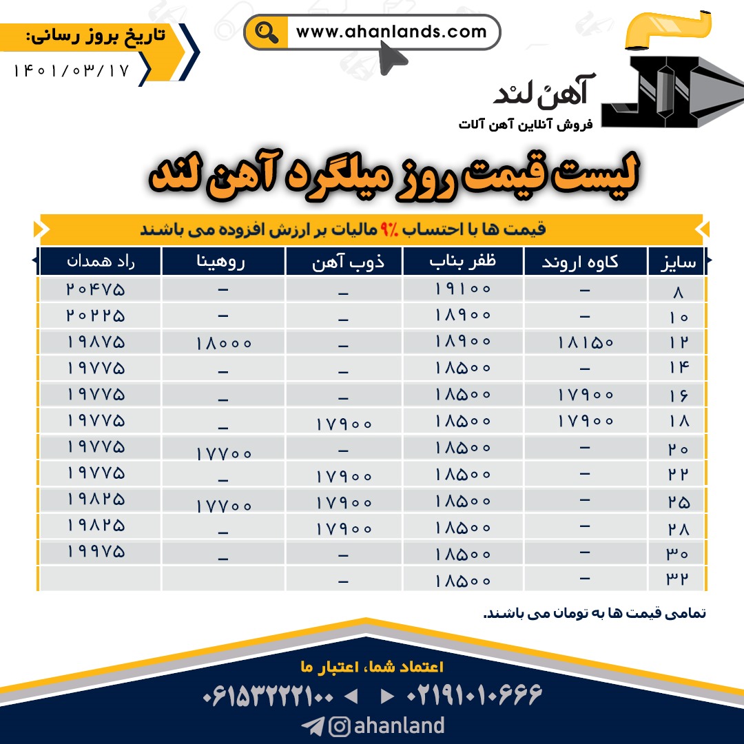 لیست قیمت هفدهم خرداد ۱۴۰۱ برای مشاهده آنلاین قیمت انواع مقاطع فولادی به وب سایت زیر مراجعه نمایید: WWW.AHANLANDS.COM ⚜اعتماد شما اعتبار ماست⚜ ارتباط با کارشناسان ما: https://zil.ink/ahanland 📍آدرس اینستاگرام آهن لند https://lnkd.in/d۴epHFt