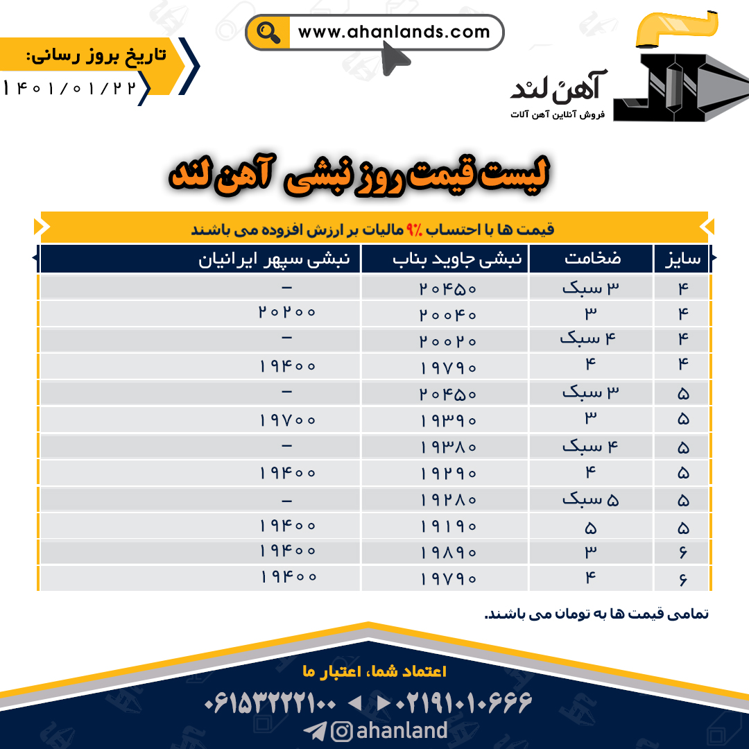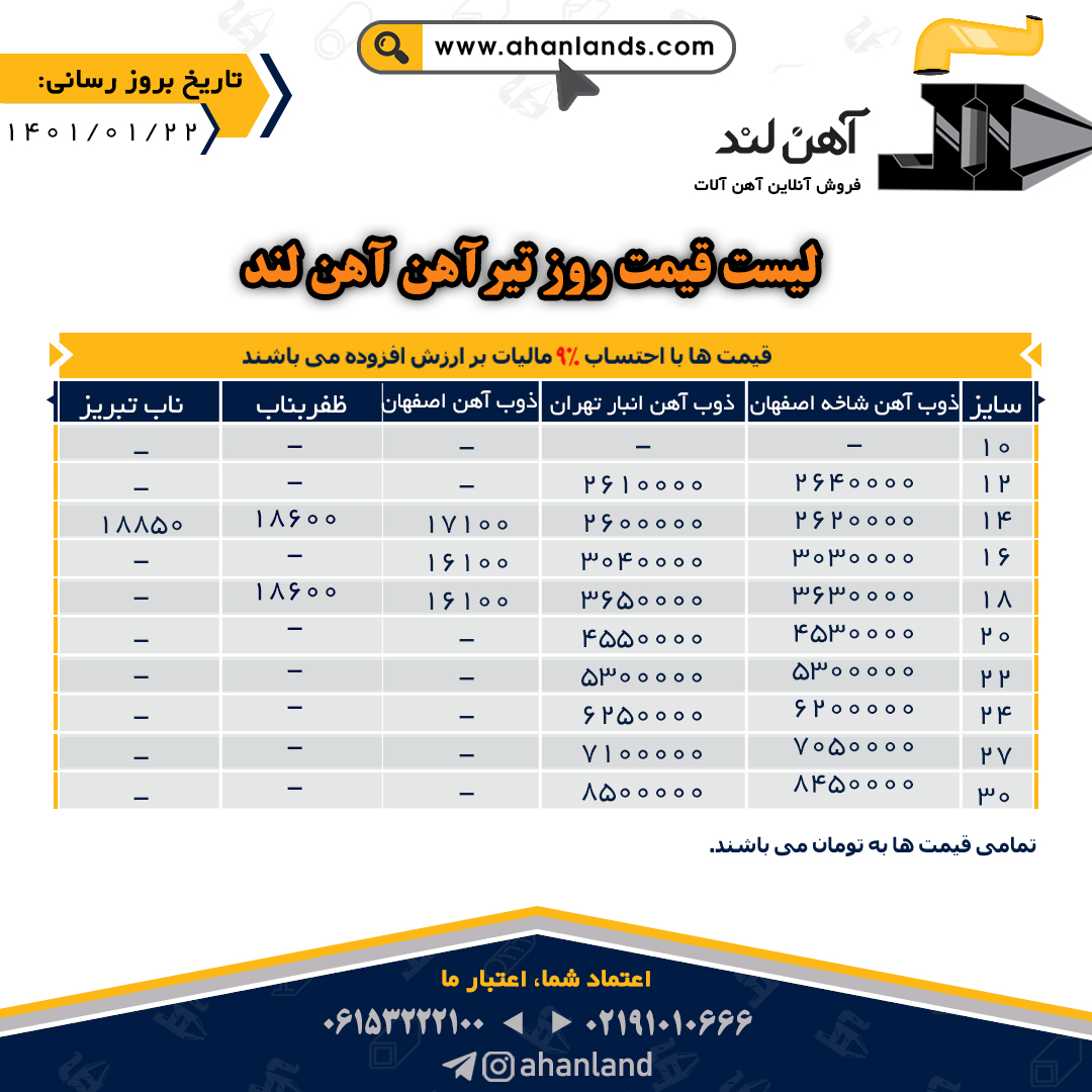 لیست قیمت بیست و دوم فروردین ۱۴۰۱ برای مشاهده آنلاین قیمت انواع مقاطع فولادی به وب سایت زیر مراجعه نمایید: WWW.AHANLANDS.COM ⚜اعتماد شما اعتبار ماست⚜ ارتباط با کارشناسان ما: https://zil.ink/ahanland 📍آدرس اینستاگرام آهن لند https://lnkd.in/d۴epHFt