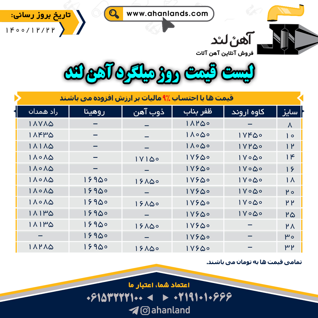 لیست قیمت بیست و چهارم اسفند ماه ۱۴۰۰ برای مشاهده آنلاین قیمت انواع مقاطع فولادی به وب سایت زیر مراجعه نمایید: WWW.AHANLANDS.COM ⚜اعتماد شما اعتبار ماست⚜ ارتباط با کارشناسان ما: https://zil.ink/ahanland 📍آدرس اینستاگرام آهن لند https://lnkd.in/d۴epHFt