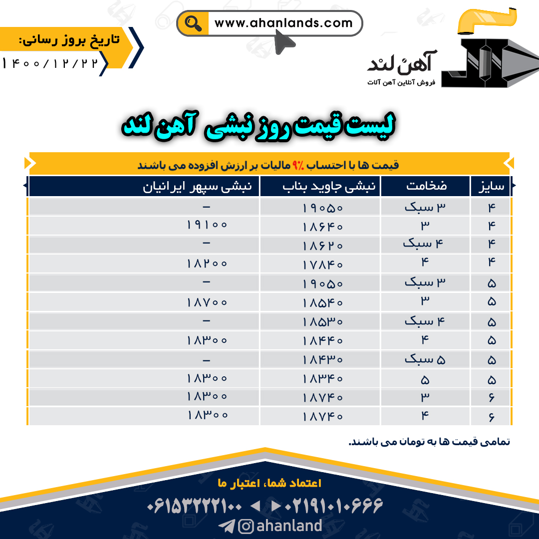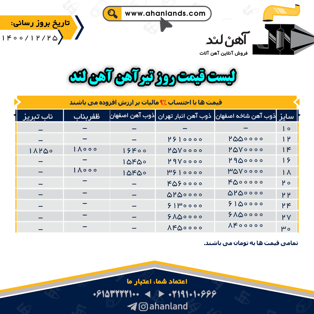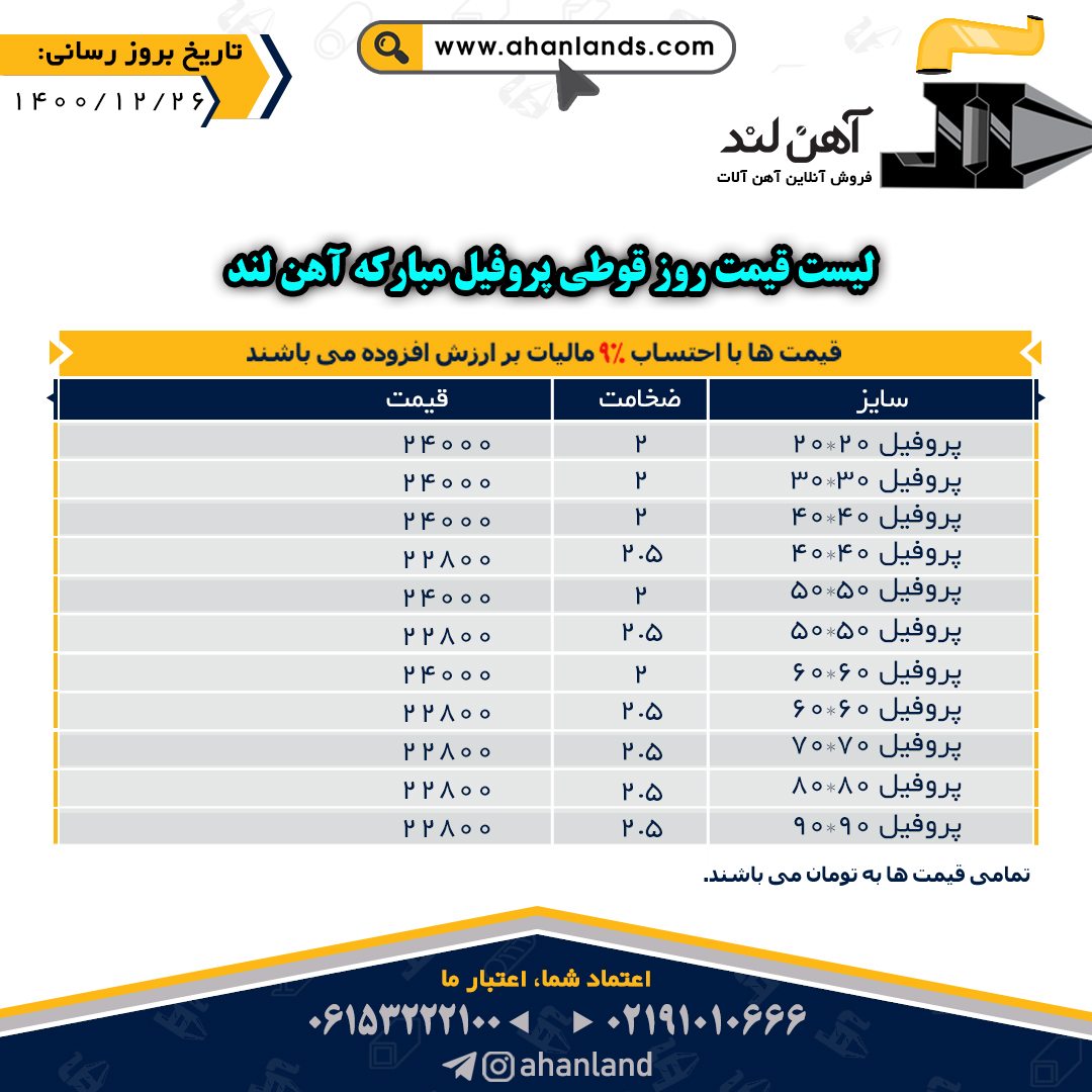لیست قیمت بیست و پنجم اسفند ماه ۱۴۰۰ برای مشاهده آنلاین قیمت انواع مقاطع فولادی به وب سایت زیر مراجعه نمایید: WWW.AHANLANDS.COM ⚜اعتماد شما اعتبار ماست⚜ ارتباط با کارشناسان ما: https://zil.ink/ahanland 📍آدرس اینستاگرام آهن لند https://lnkd.in/d۴epHFt