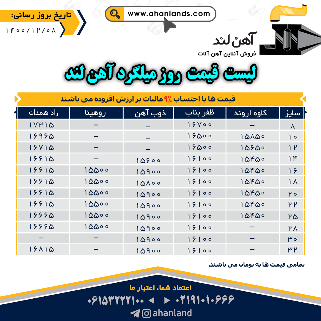لیست قیمت نهم اسفند ماه ۱۴۰۰ برای مشاهده آنلاین قیمت انواع مقاطع فولادی به وب سایت زیر مراجعه نمایید: WWW.AHANLANDS.COM ⚜اعتماد شما اعتبار ماست⚜ ارتباط با کارشناسان ما: https://zil.ink/ahanland 📍آدرس اینستاگرام آهن لند https://lnkd.in/d۴epHFt