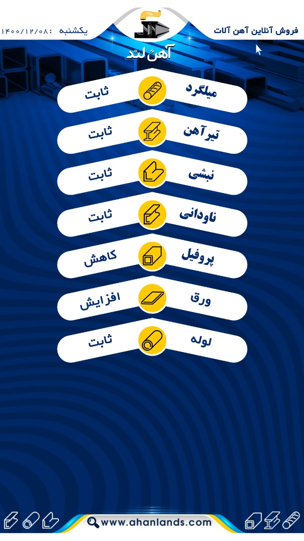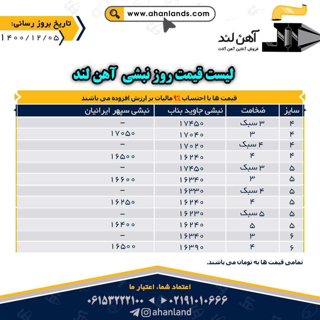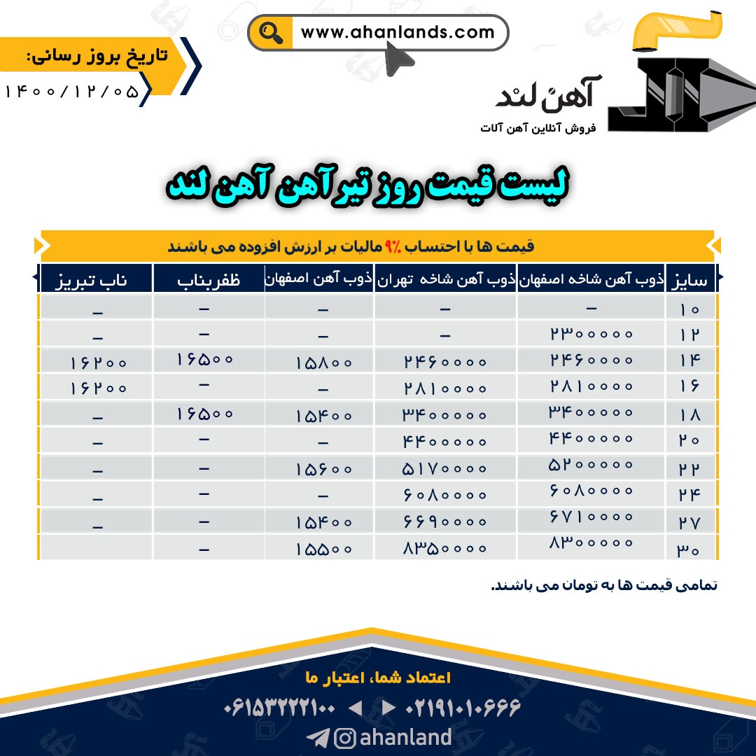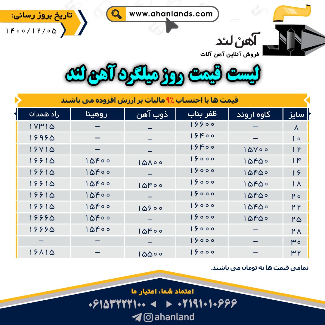 لیست قیمت پنجم اسفند ماه ۱۴۰۰ برای مشاهده آنلاین قیمت انواع مقاطع فولادی به وب سایت زیر مراجعه نمایید: WWW.AHANLANDS.COM ⚜اعتماد شما اعتبار ماست⚜ ارتباط با کارشناسان ما: https://zil.ink/ahanland 📍آدرس اینستاگرام آهن لند https://lnkd.in/d۴epHFt