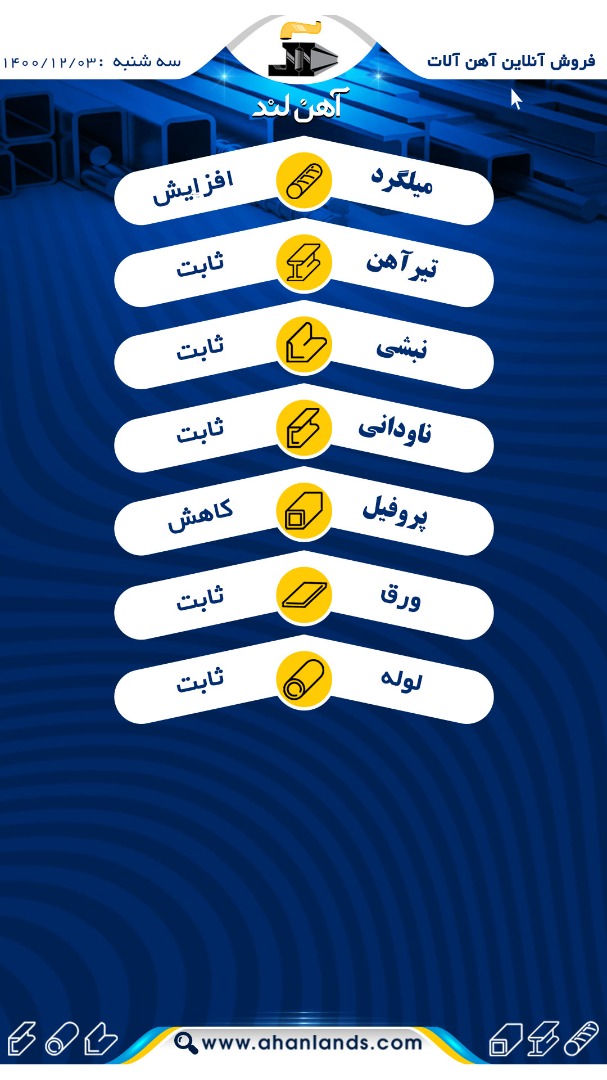 لیست قیمت چهارم اسفند ماه ۱۴۰۰ برای مشاهده آنلاین قیمت انواع مقاطع فولادی به وب سایت زیر مراجعه نمایید: WWW.AHANLANDS.COM ⚜اعتماد شما اعتبار ماست⚜ ارتباط با کارشناسان ما: https://zil.ink/ahanland 📍آدرس اینستاگرام آهن لند https://lnkd.in/d۴epHFt