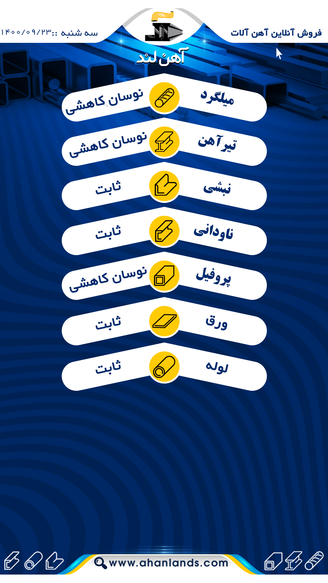 لیست قیمت بیست و سوم اذر ماه ۱۴۰۰ برای مشاهده آنلاین قیمت انواع مقاطع فولادی به وب سایت زیر مراجعه نمایید: WWW.AHANLANDS.COM ⚜اعتماد شما اعتبار ماست⚜ ارتباط با کارشناسان ما: https://zil.ink/ahanland 📍آدرس اینستاگرام آهن لند https://lnkd.in/d۴epHFt