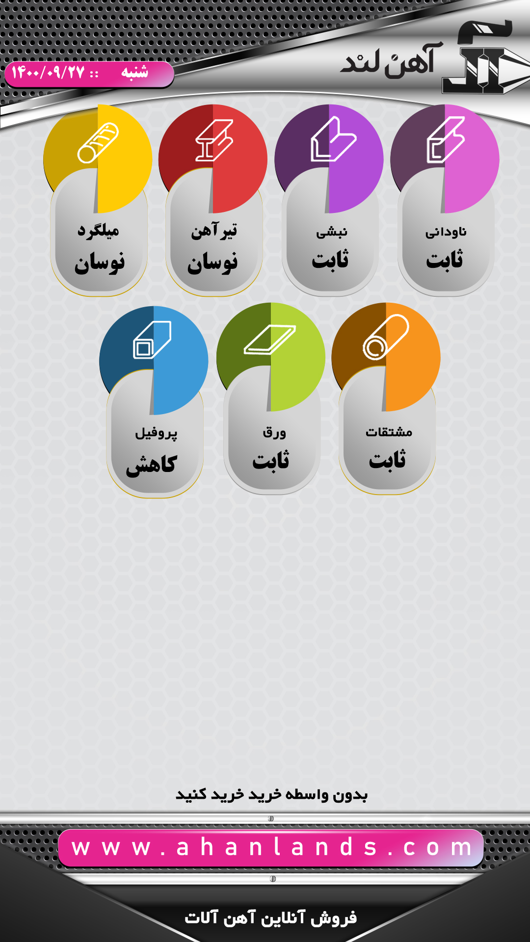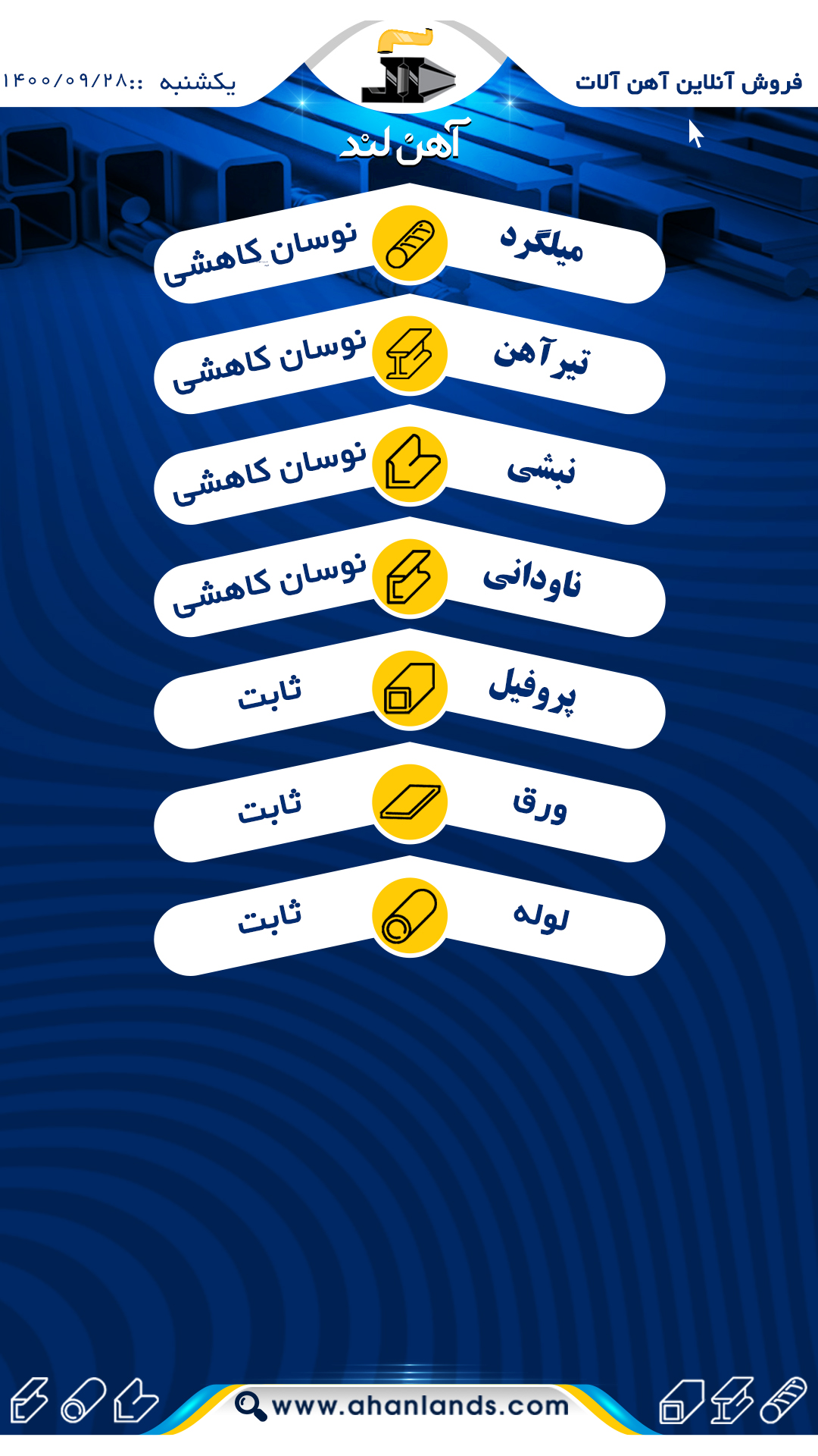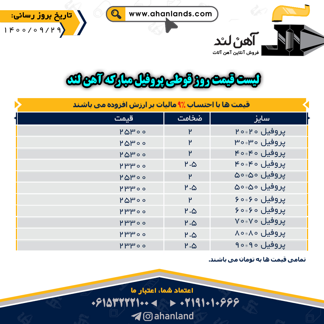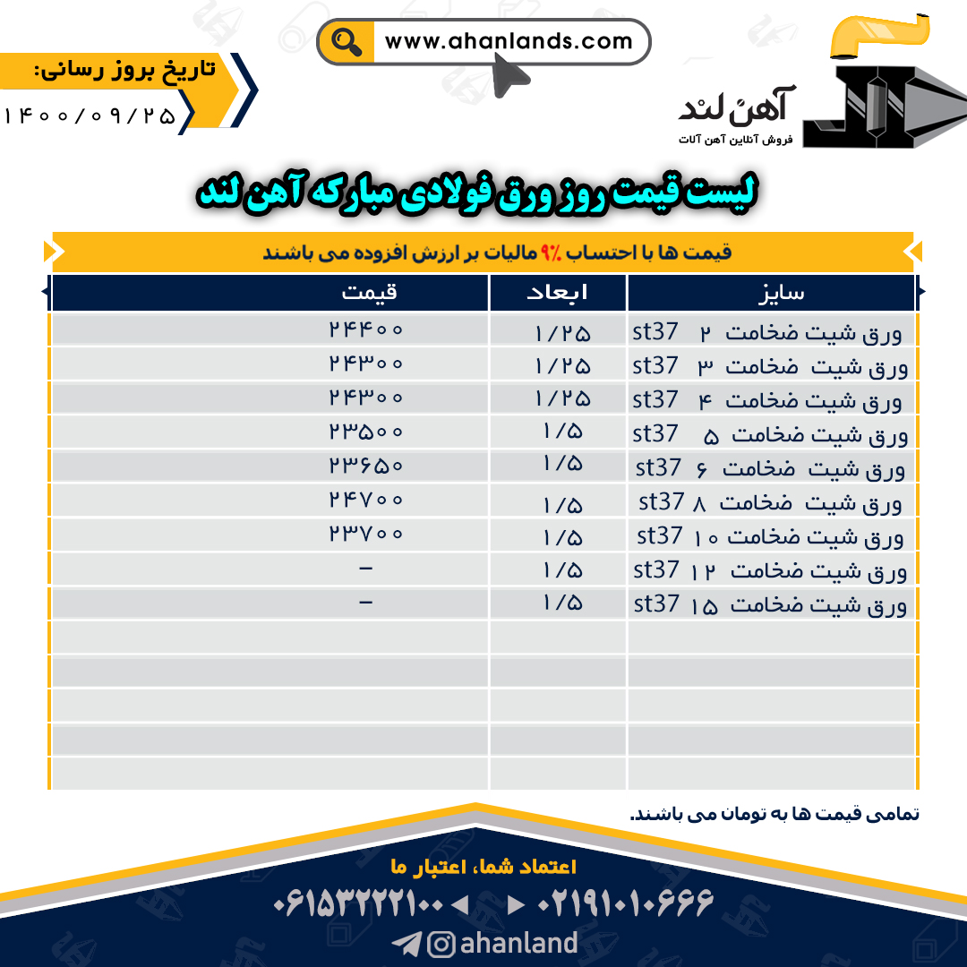 لیست قیمت سی اذر ماه ۱۴۰۰ برای مشاهده آنلاین قیمت انواع مقاطع فولادی به وب سایت زیر مراجعه نمایید: WWW.AHANLANDS.COM ⚜اعتماد شما اعتبار ماست⚜ ارتباط با کارشناسان ما: https://zil.ink/ahanland 📍آدرس اینستاگرام آهن لند https://lnkd.in/d۴epHFt