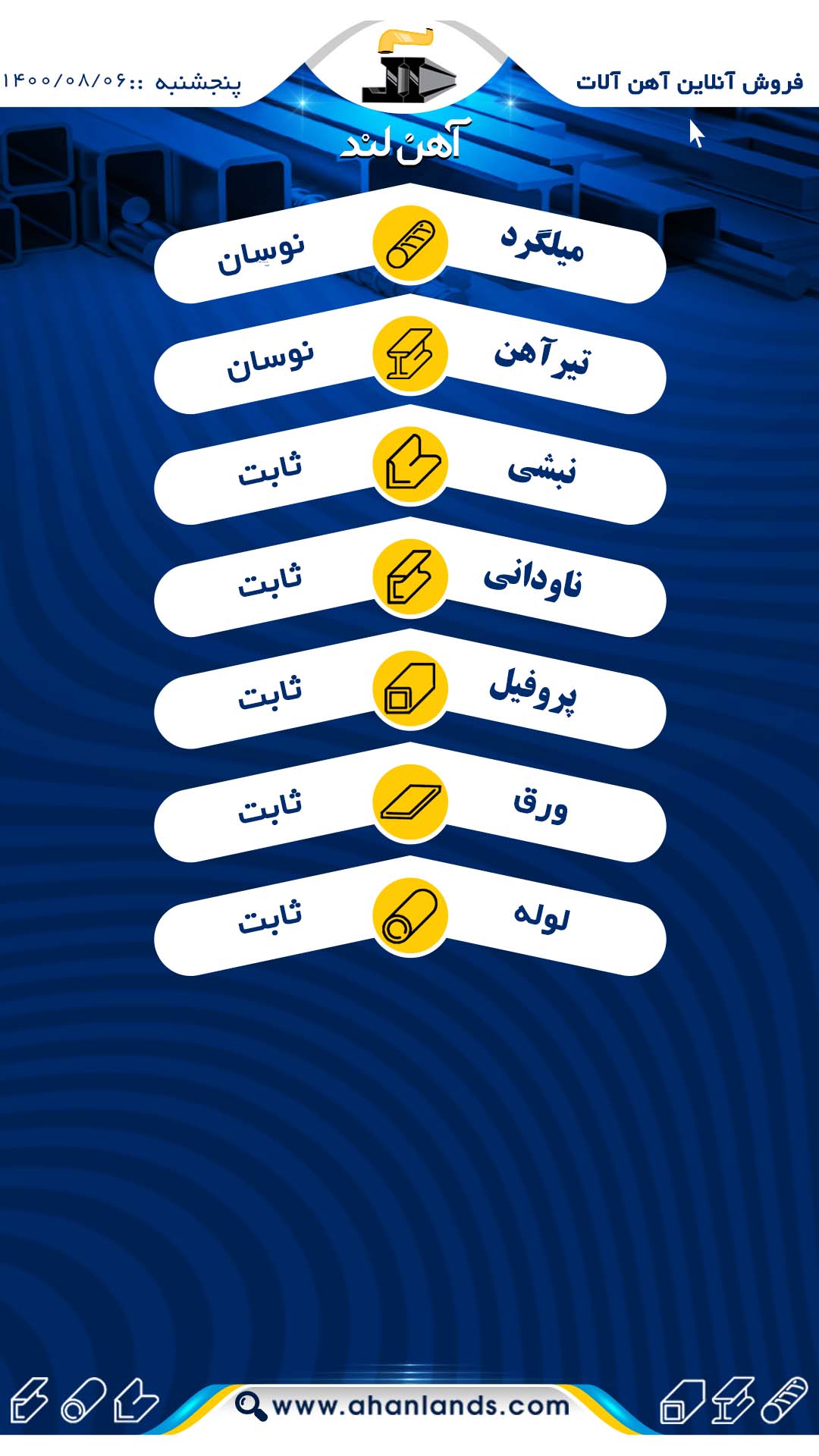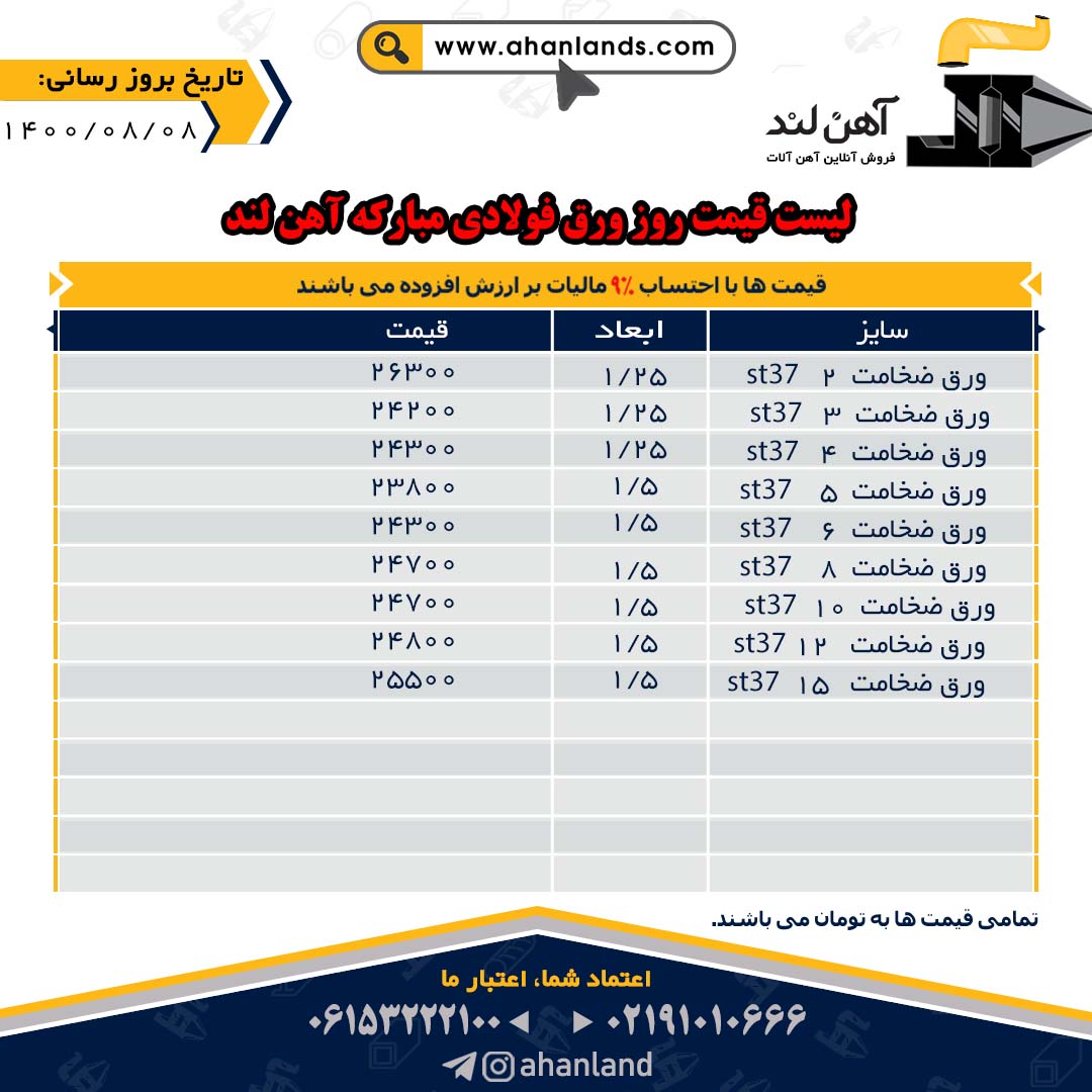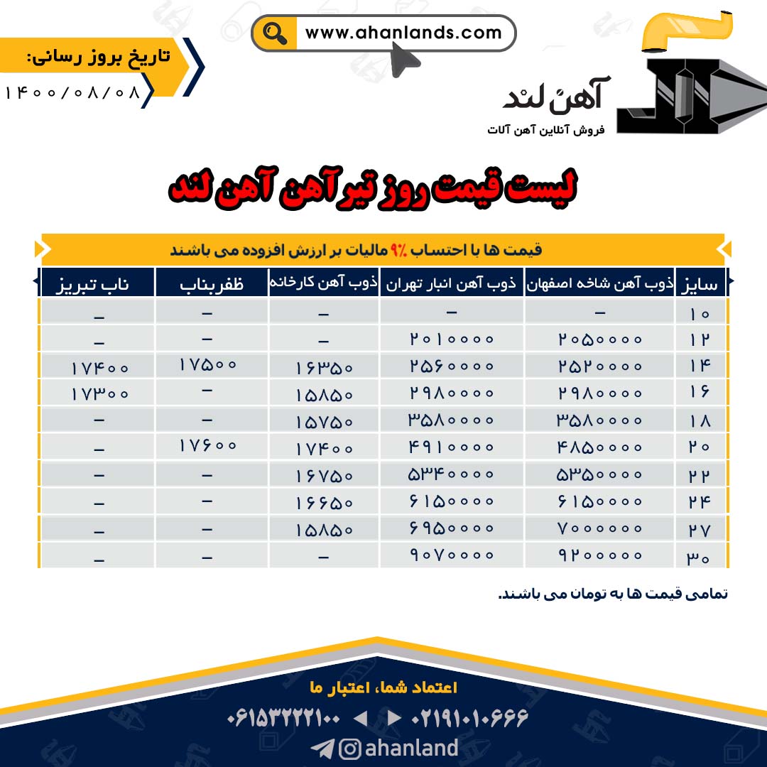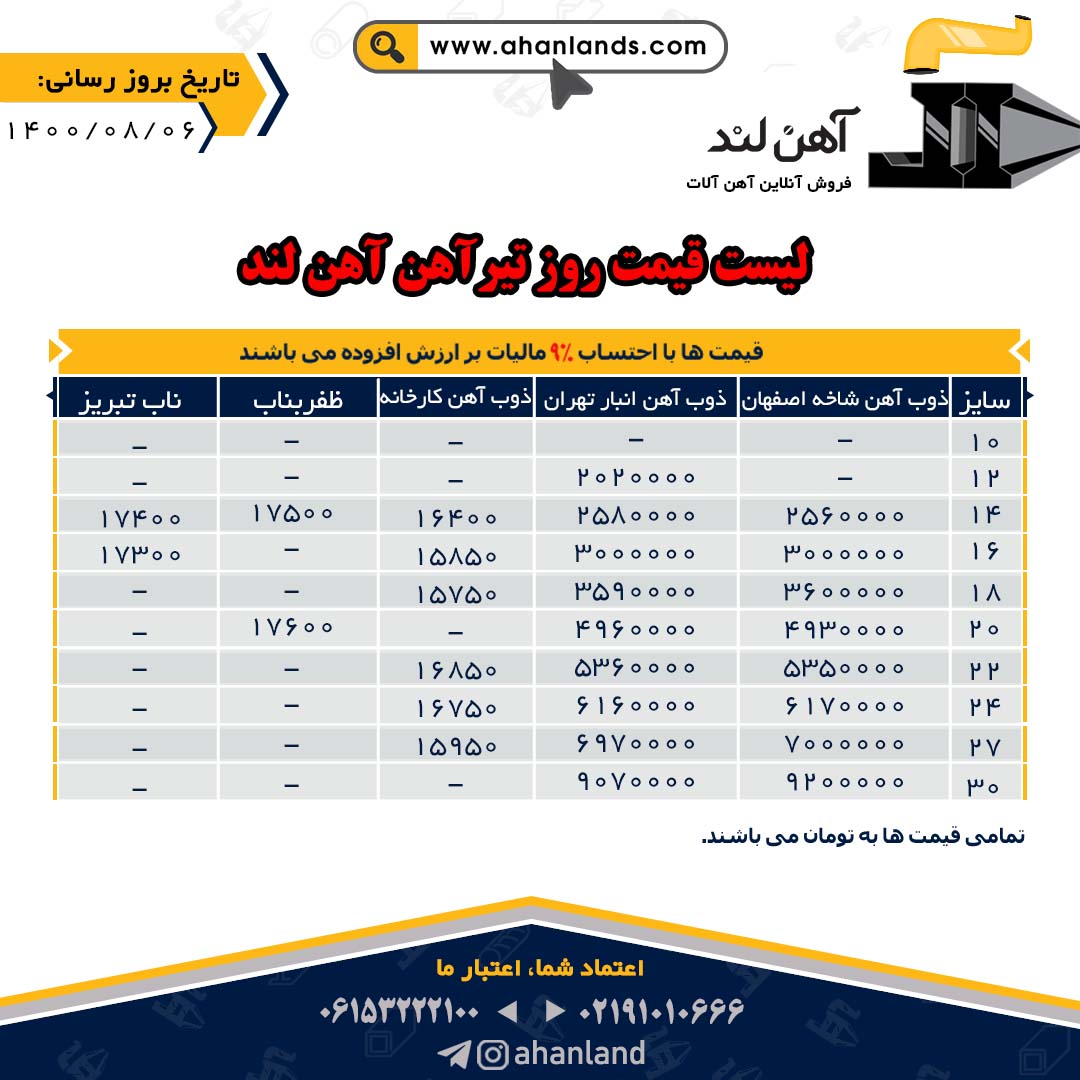 لیست قیمت نهم آبان ماه ۱۴۰۰ برای مشاهده آنلاین قیمت انواع مقاطع فولادی به وب سایت زیر مراجعه نمایید: WWW.AHANLANDS.COM ⚜اعتماد شما اعتبار ماست⚜ ارتباط با کارشناسان ما: https://zil.ink/ahanland 📍آدرس اینستاگرام آهن لند https://lnkd.in/d۴epHFt