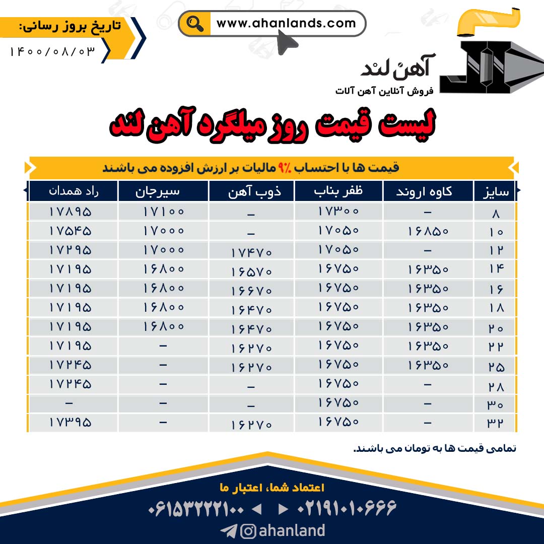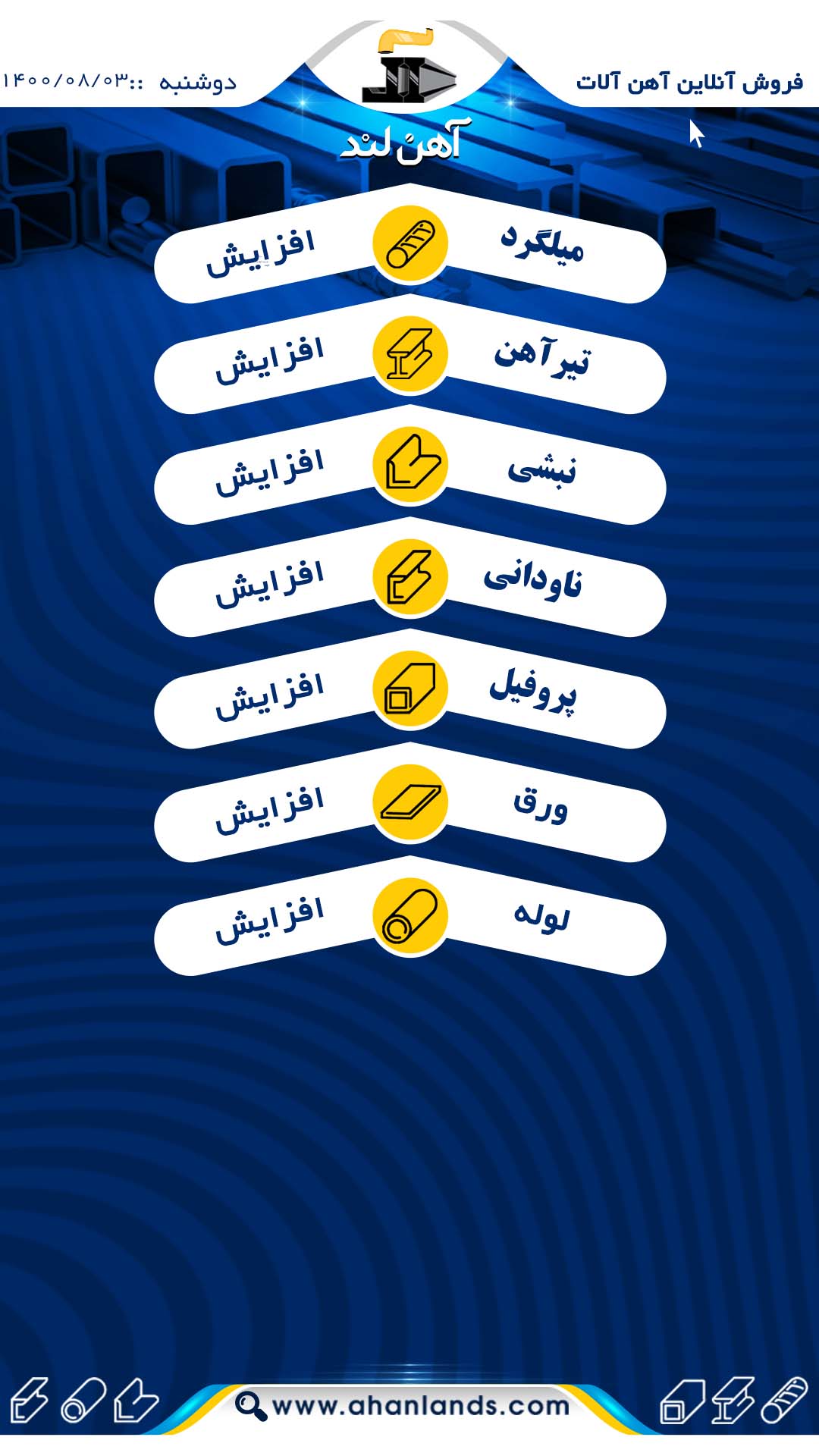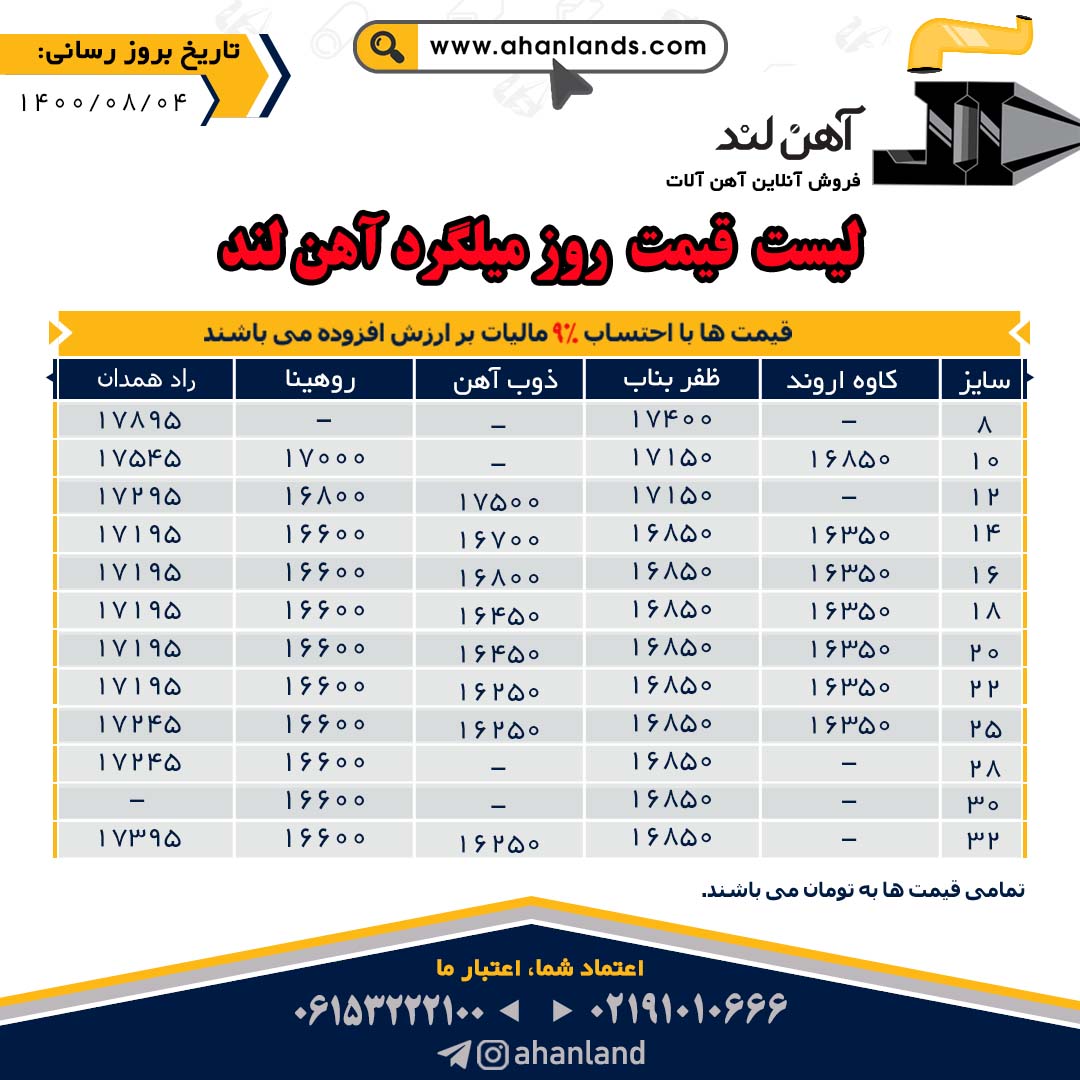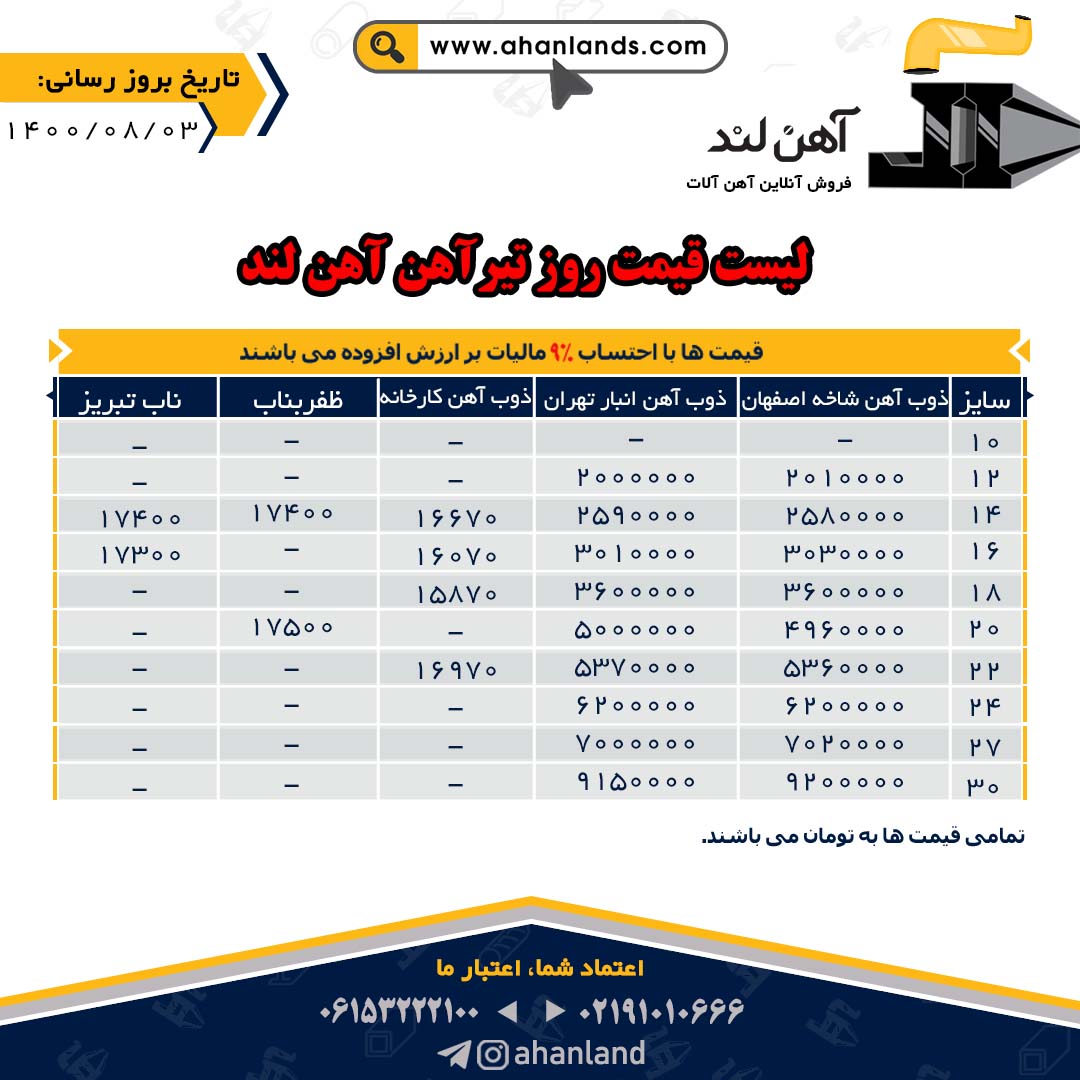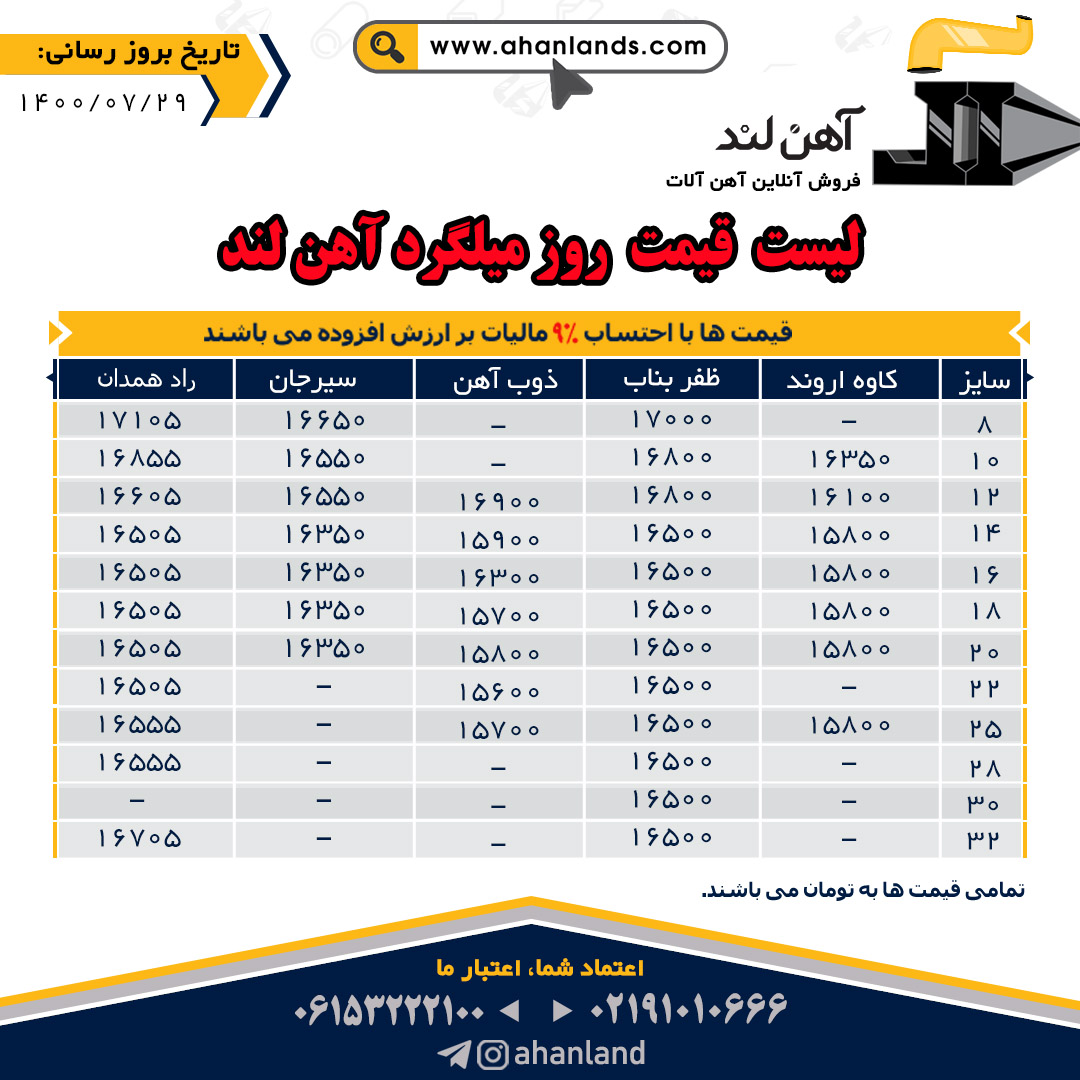 لیست قیمت سوم آبان ماه ۱۴۰۰ برای مشاهده آنلاین قیمت انواع مقاطع فولادی به وب سایت زیر مراجعه نمایید: WWW.AHANLANDS.COM ⚜اعتماد شما اعتبار ماست⚜ ارتباط با کارشناسان ما: https://zil.ink/ahanland 📍آدرس اینستاگرام آهن لند https://lnkd.in/d۴epHFt
