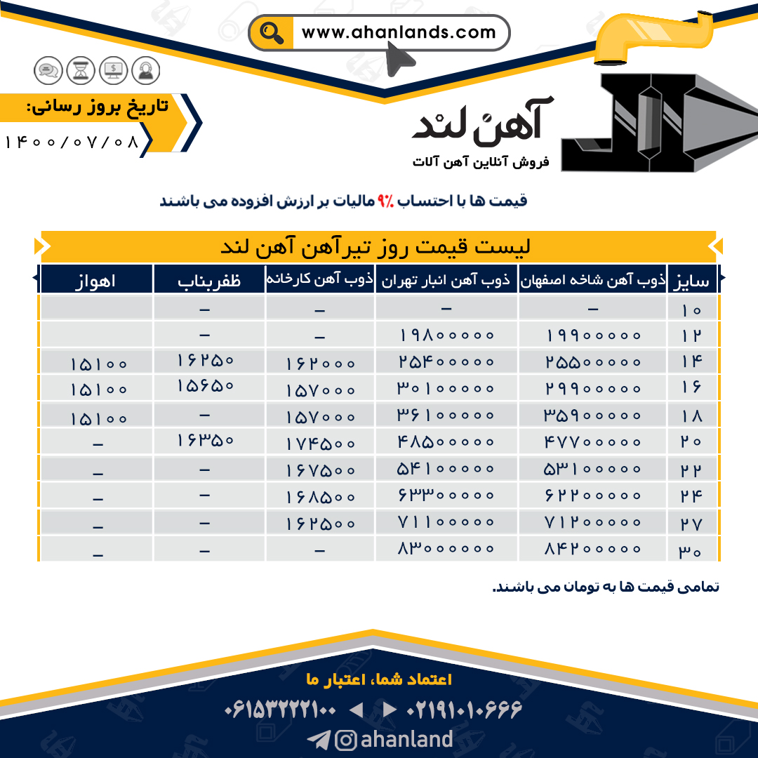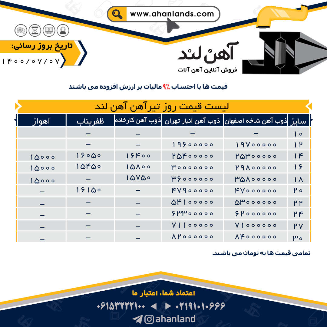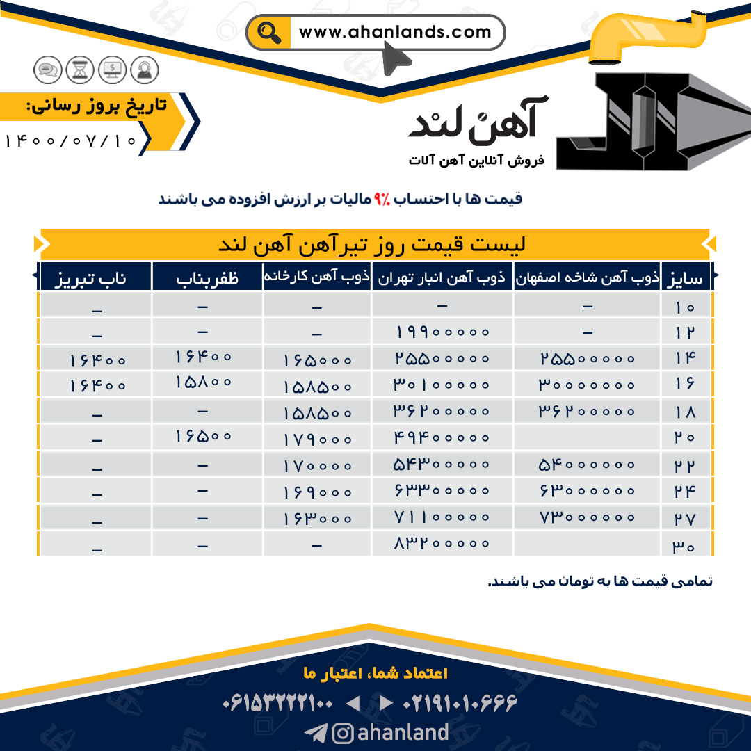لیست قیمت دهم مهر ماه ۱۴۰۰ برای مشاهده آنلاین قیمت انواع مقاطع فولادی به وب سایت زیر مراجعه نمایید: WWW.AHANLANDS.COM ⚜اعتماد شما اعتبار ماست⚜ ارتباط با کارشناسان ما: https://zil.ink/ahanland 📍آدرس اینستاگرام آهن لند https://lnkd.in/d۴epHFt