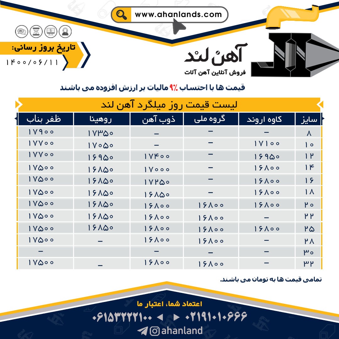 لیست قیمت یازدهم شهریور ماه ۱۴۰۰ برای مشاهده آنلاین قیمت انواع مقاطع فولادی به وب سایت زیر مراجعه نمایید: WWW.AHANLANDS.COM ⚜اعتماد شما اعتبار ماست⚜ ارتباط با کارشناسان ما: https://zil.ink/ahanland 📍آدرس اینستاگرام آهن لند https://lnkd.in/d۴epHFt