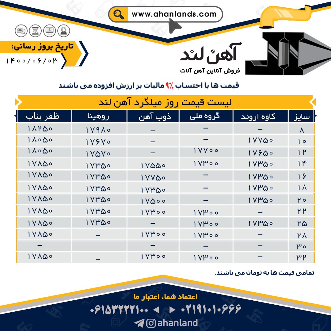 لیست قیمت سوم شهریور ماه ۱۴۰۰ برای مشاهده آنلاین قیمت انواع مقاطع فولادی به وب سایت زیر مراجعه نمایید: WWW.AHANLANDS.COM ⚜اعتماد شما اعتبار ماست⚜ ارتباط با کارشناسان ما: https://zil.ink/ahanland 📍آدرس اینستاگرام آهن لند https://lnkd.in/d۴epHFt