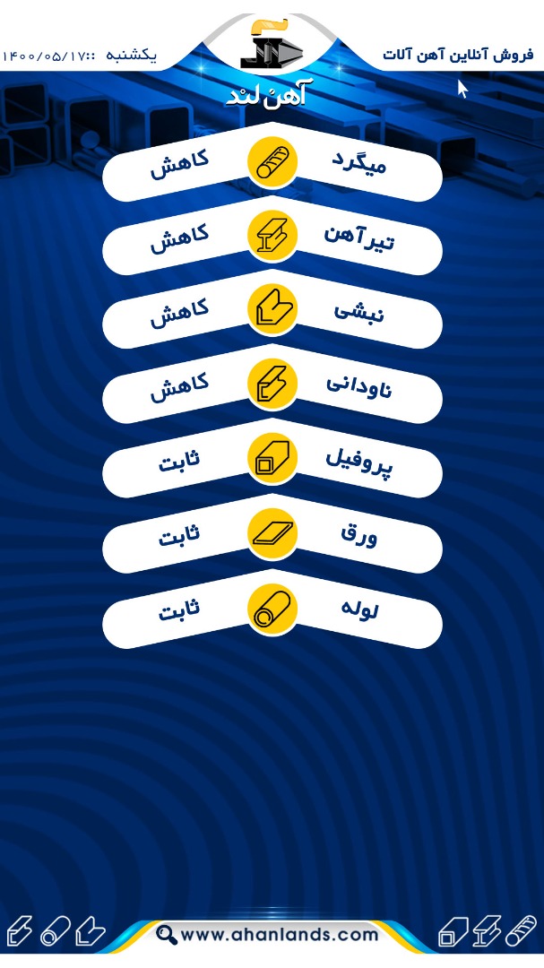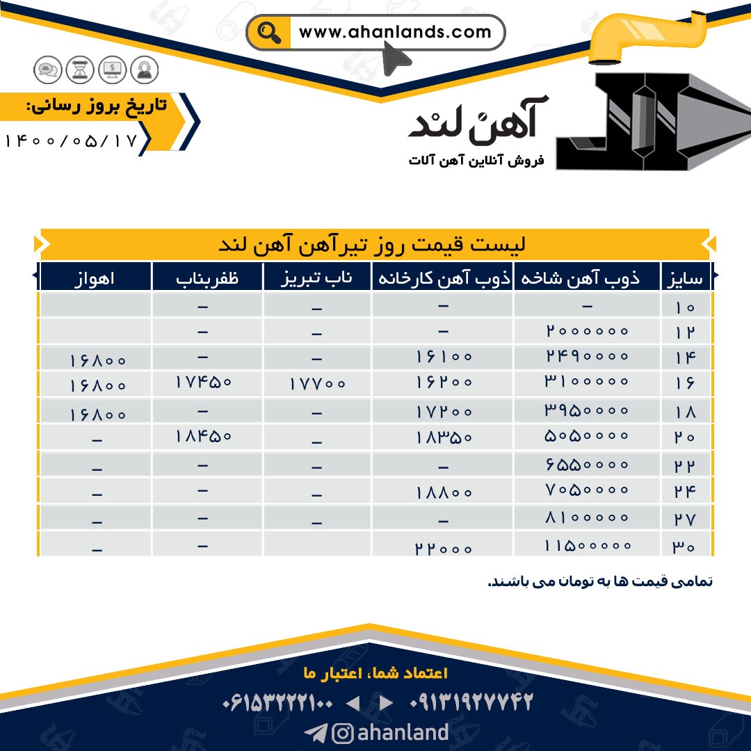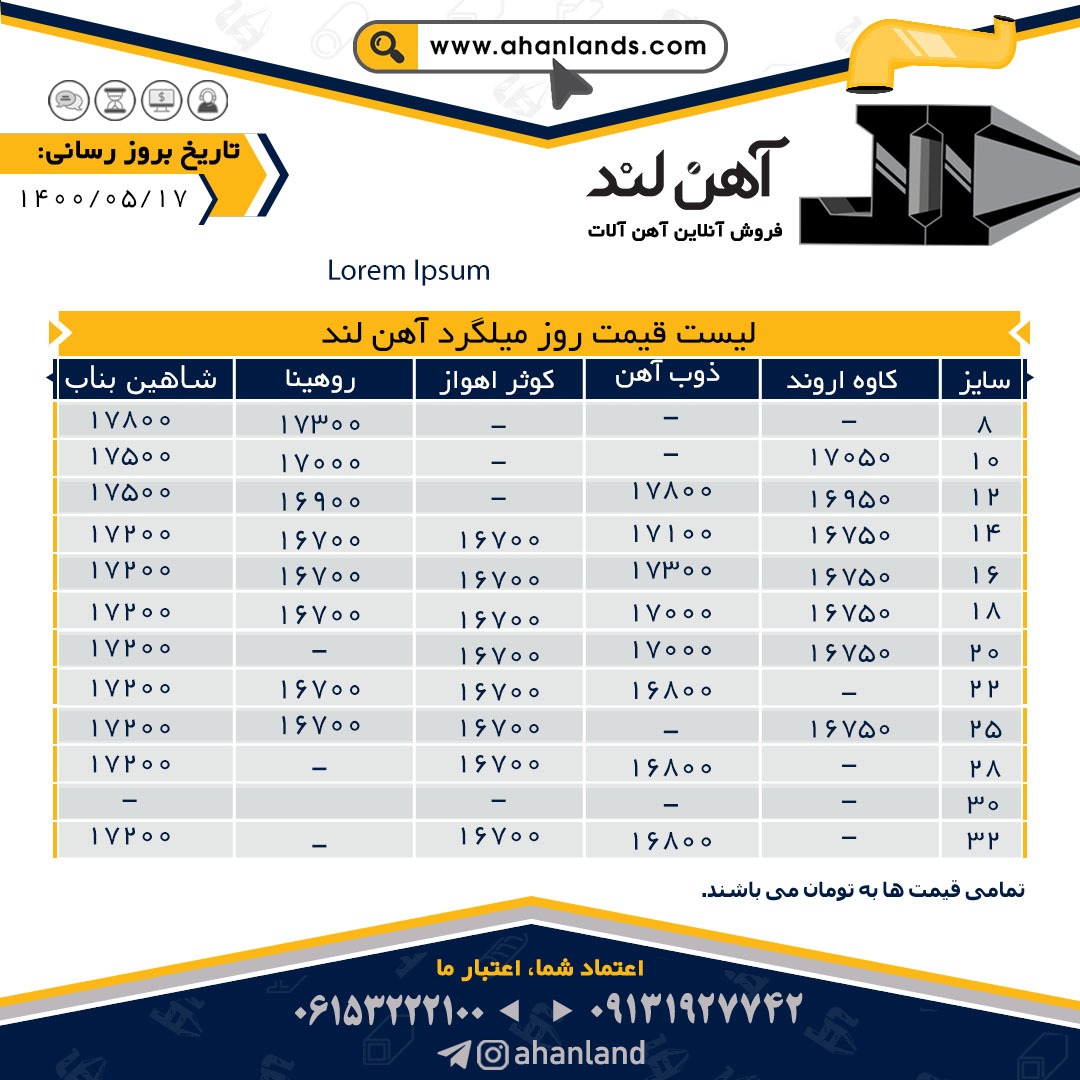 لیست قیمت هفدهم مردادماه ۱۴۰۰ برای مشاهده آنلاین قیمت انواع مقاطع فولادی به وب سایت زیر مراجعه نمایید: WWW.AHANLANDS.COM ⚜اعتماد شما اعتبار ماست⚜ ارتباط با کارشناسان ما: https://zil.ink/ahanland 📍آدرس اینستاگرام آهن لند https://lnkd.in/d۴epHFt