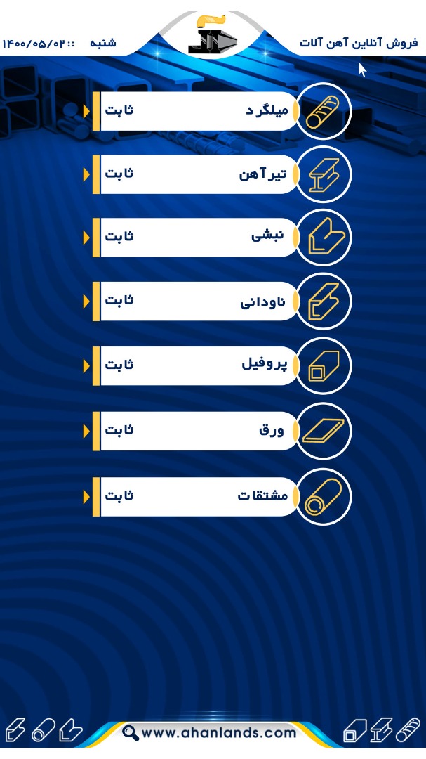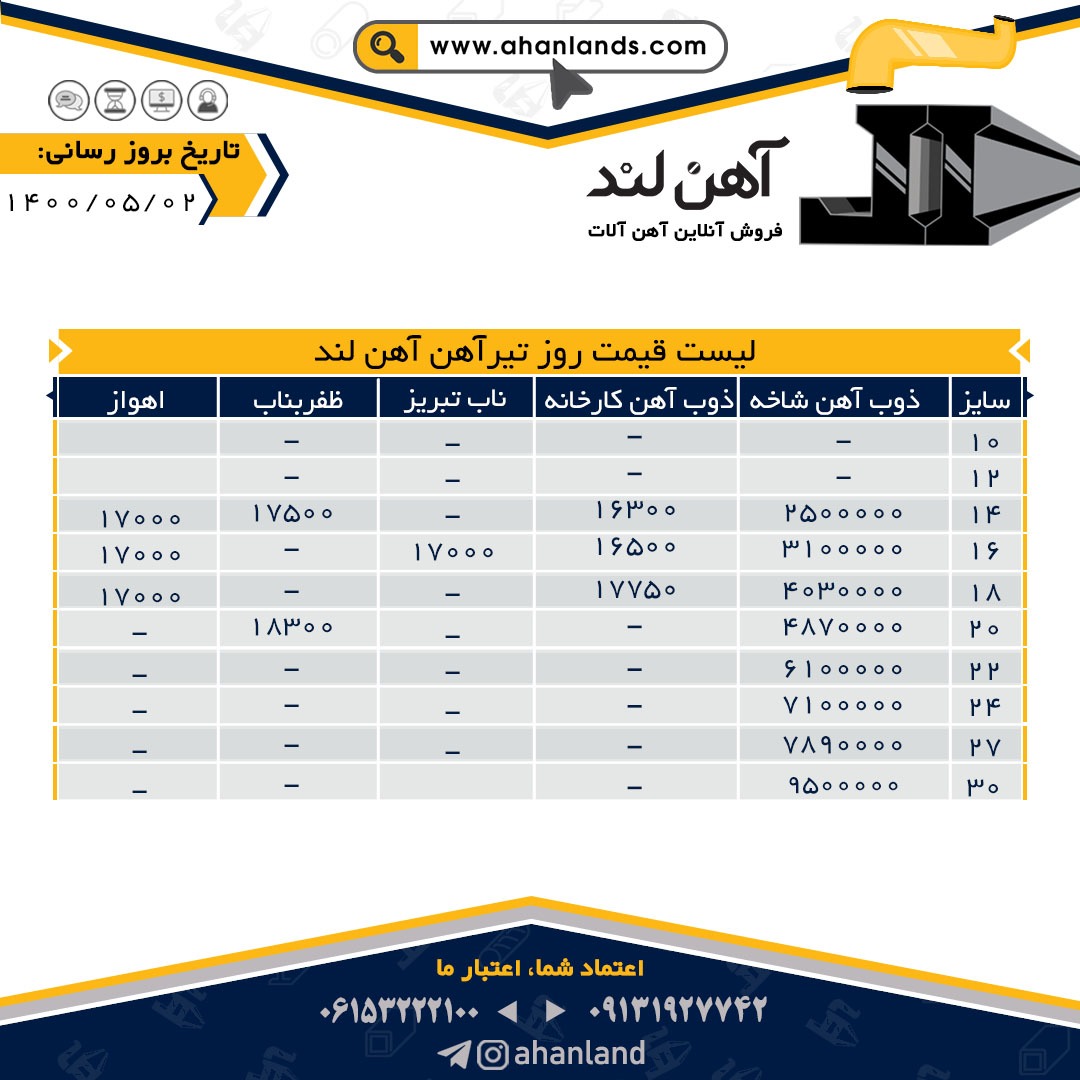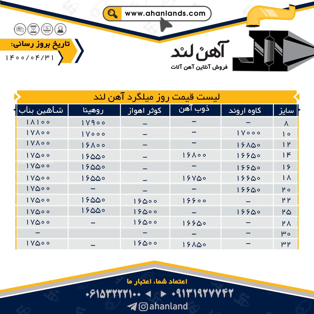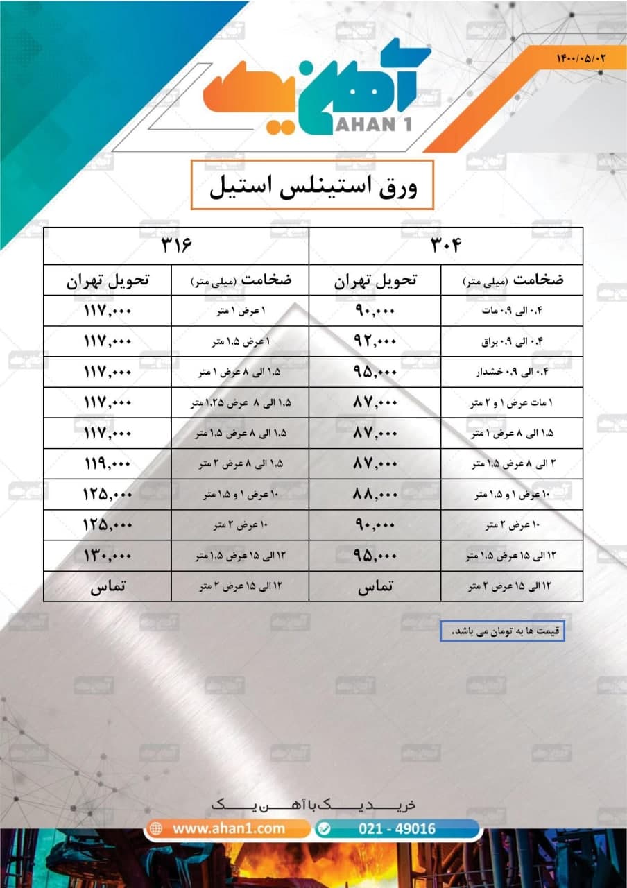 لیست قیمت دوم مردادماه ۱۴۰۰ برای مشاهده آنلاین قیمت انواع مقاطع فولادی به وب سایت زیر مراجعه نمایید: WWW.AHANLANDS.COM ⚜اعتماد شما اعتبار ماست⚜ ارتباط با کارشناسان ما: https://zil.ink/ahanland 📍آدرس اینستاگرام آهن لند https://lnkd.in/d۴epHFt