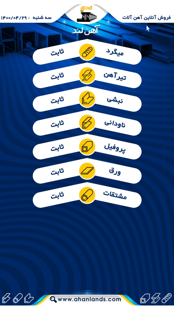 لیست قیمت بیست و نهم تیرماه ۱۴۰۰ برای مشاهده آنلاین قیمت انواع مقاطع فولادی به وب سایت زیر مراجعه نمایید: WWW.AHANLANDS.COM ⚜اعتماد شما اعتبار ماست⚜ ارتباط با کارشناسان ما: https://zil.ink/ahanland 📍آدرس اینستاگرام آهن لند https://lnkd.in/d۴epHFt