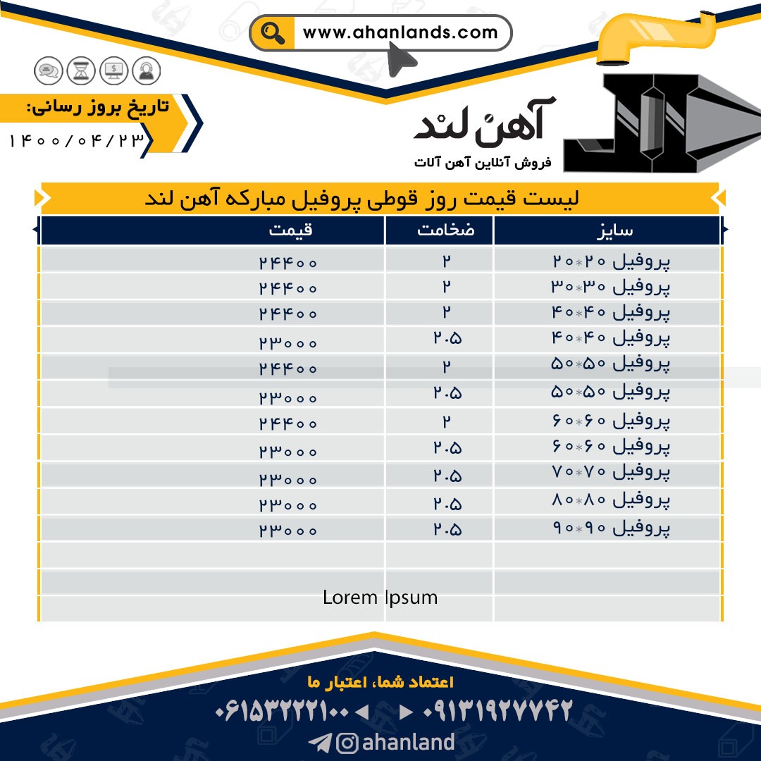 لیست قیمت بیست و سوم تیرماه ۱۴۰۰ برای مشاهده آنلاین قیمت انواع مقاطع فولادی به وب سایت زیر مراجعه نمایید: WWW.AHANLANDS.COM ⚜اعتماد شما اعتبار ماست⚜ ارتباط با کارشناسان ما: https://zil.ink/ahanland 📍آدرس اینستاگرام آهن لند https://lnkd.in/d۴epHFt