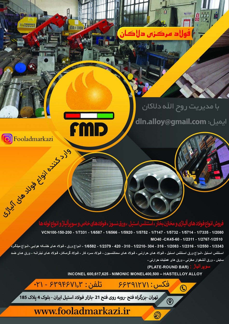 به نام خداوند بخشنده مهربان شرکت فولاد مرکزی دلاکان سالهاست که فعالیت خود را در تامین متریال های مورد نیاز شرکت ها به عهده گرفته و توانسته نام نیکی در عرضه کننده های فولاد آلیاژی به جای بگذارد. تاکنون توانسته ایم با جمعی از پیمانکاران شرکت های نفت و گاز و صنعتی کشور همکاری قابل توجهی را داشته باشیم. فروش فولاد سردکار ، گرمکار ، سمانته سیون ، فولاد فنر ، قالب پلاستیک ، نیتراته ، خشکه هوای و... 42CrMo4 – 25CrMo4 – 4130 – 4140 – 1/7131 – 1/5920 – 1/2550 – 1/2379 1/2436 – 1/2344 – 1/2343 – 1/2567 – 1/1191 – 1/1221 – 1/2080 – 1/3343 1/2312 – 1/2738 – 1/7103 – 1/7335 – CK75 – CK60 – 1.6587 – VCN150 فروش میلگرد ورق و لوله استنلس استیل : 316L – 316 – 309 – 310 – 310S – 304 – 304L – 321 – 410 – 420 – 4841 – 431 فروش انواع ورق های آلیاژی و مخازن بخار : A572 GR 50 - A516 Grad (60,70) – A283 grad C – A285grad C – 17MN4 - P265GHII – ST52 – ST44 – ST37 – A387 grad (11,12) – hardox 400 , 450 500 , 550 , 600 –CK45 – CK60 – CK67 – CK75 – S235JR – ST12 – ST14 S355JR+AR – S355JO – S355J2G3 – S355J2+N – S355K2G3 –S355NLZ S275JR – S275JO – S235JO – 4130 – 1/7218 – MO40 – CORTON A , B فروش انواع لوله های آلیاژی ، درزدار ، بدون درز ، مانیسمان ، گالوانیزه و... : A106 grad B – X52,X60,X70,X42 – API 5L – ST37 – A333 grad 6 – A335 فروش انواع سوپرآلیاژ به صورت میلگرد ورق و لوله : INCONEL 600,617,625 – NIMONIC MONEL 400,500 – HASTELLOY ALLOY با توجه به توانایی این شرکت بدینوسیله آمادگی خود را جهت همکاری با آن شرکت محترم اعلام میداریم . ارتباط با ما : تلفن : 66806300 – 66811945 – 66394673 - 66394671 تلفکس : 66391271 وبسایت : www.FoladMarkazi.com – www.fooladdalakan.com ایمیل : Dln.alloy@gmail.com – dalakanfoolad@gmail.com آدرس : تهران ، بزرگراه فتح ،کیلومتر 4 ، بعد از شیر پاستوریزه ، بازار فولاد استیل ایران، بلوک4 پلاک 185