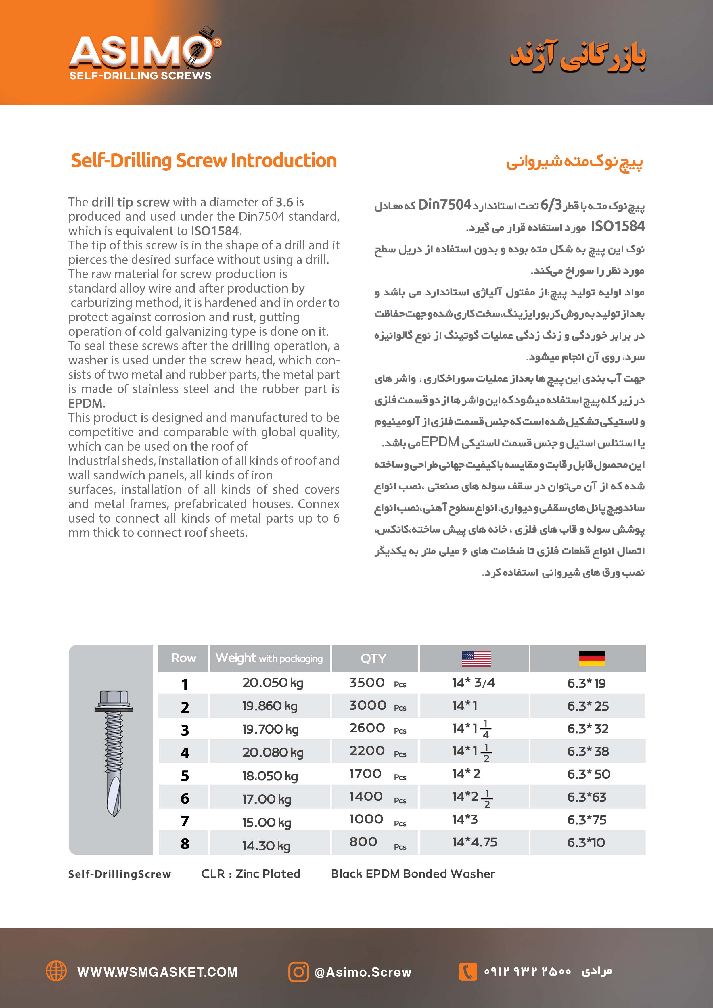 پیچ نوک متـه شیروانی با قطر3/6 تحت استاندارد Din7504 که معـادل ISO1584 مورد استفاده قرار می گیرد. نوک این پیچ به شکل مته بوده و بدون استفاده از دریل سطح مورد نظر را سوراخ میکند. مواد اولیه تولید پیچ،از مفتول آلیاژی استاندارد می باشد و بعداز تولید به روش کربورایزینگ،سخت کاری شده و جهت حفاظت در برابر خوردگی و زنگ زدگی عملیات گوتینگ از نوع گالوانیزه سرد، روی آن انجام میشود. جهت آب بندی این پیچ ها بعداز عملیات سوراخکاری ، واشر های در زیر کله پیچ استفاده میشود که این واشر ها از دو قسمت فلزی و لاستیکی تشکیل شده است که جنس قسمت فلزی از آلومینیوم یا استنلس استیل و جنس قسمت لاستیکی EPDM می باشد. این محصول قابل رقابت و مقایسه با کیفیت جهانی طراحی و ساخته شده که از آن میتوان در سقف سوله های صنعتی ،نصب انواع ساندویچ پانل های سقفی و دیواری، انواع سطوح آهنی،نصب انواع پوشش سوله و قاب های فلزی ، خانه های پیش ساخته،کانکس، اتصال انواع قطعات فلزی تا ضخامت های 6 میلی متر به یکدیگر نصب ورق های شیروانی استفاده کرد.