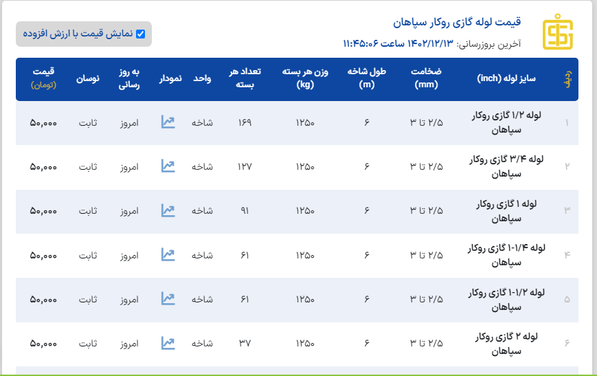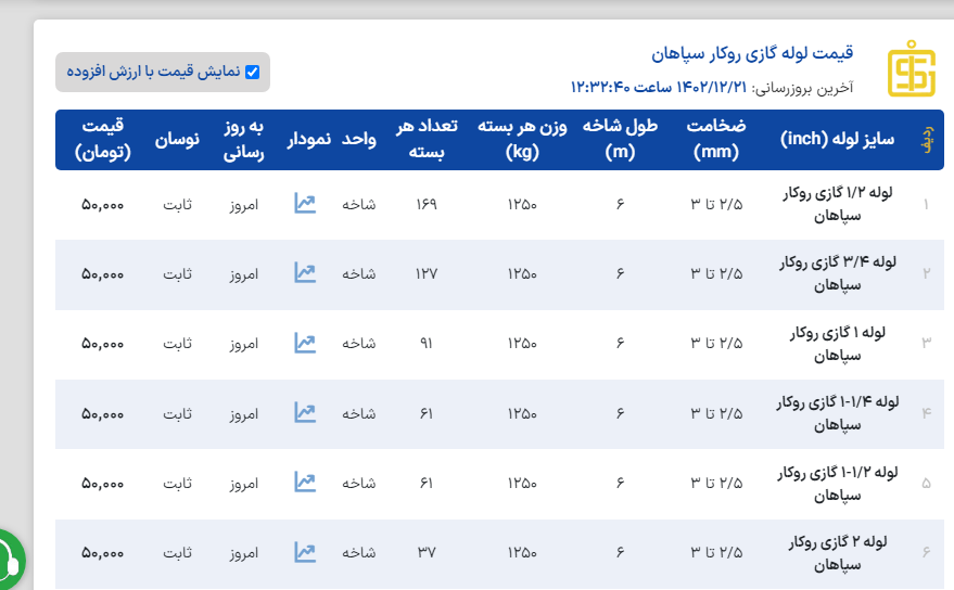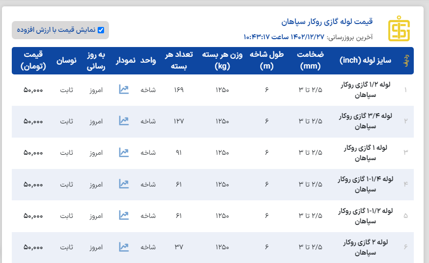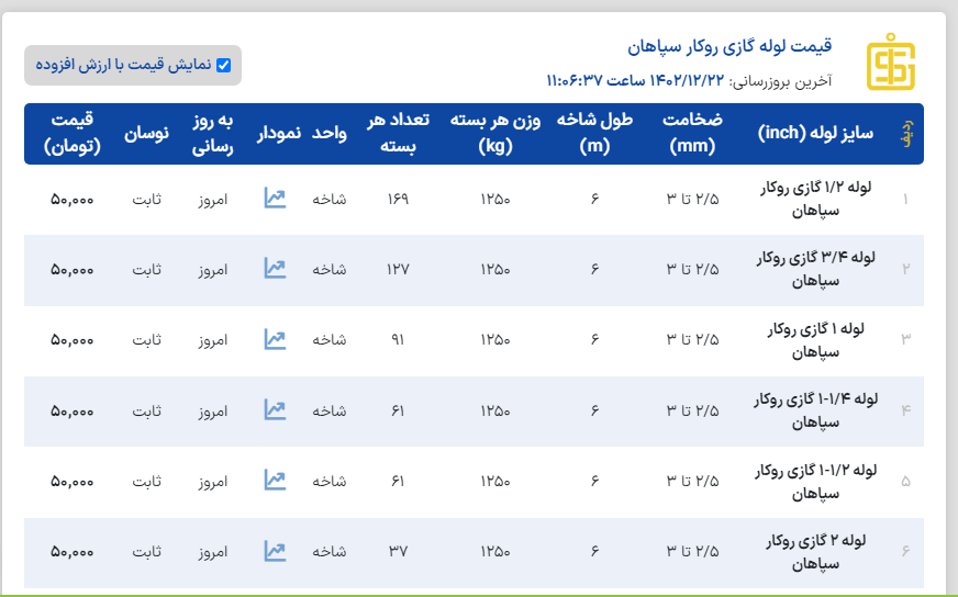 #لیست_کچو لوله گاز روکار خانگی("۳/۴و "۱/۲) ضخامت ۲/۳۵⬅️ 47800 تومان لوله گاز روکار خانگی("۱/۴-۱ و" ۱) ضخامت ۲/۸⬅️ 47800 تومان لوله گاز روکار خانگی("۳/۴و "۱/۲) ضخامت ۲/۵⬅️ 47300 تومان لوله گاز روکار خانگی("۱تا "۴) ضخامت ۳تا۴⬅️ 47300 تومان لوله گاز توکار (API) ("۴تا"۱/۲) ضخامت ۲/۶ تا ۴/۲⬅️ 49000 تومان لوله تست شده(۱/۲-۲تا" ۴) ضخامت ۳ تا ۳/۵⬅️ 46000 تومان لوله تست شده (۱/۲-۱ و" ۱/۲) ضخامت ۲/۲ تا ۲/۸⬅️ 47300 تومان 📌قیمتها با احتساب ۹٪ مالیات و فروش رسمی میباشد✅ 📞031-45400945 📞031-91013608 📲09131273851 آقای مولوی 📲09137412265 خانم صحراکار 📲09137412146 خانم امیری www.aflakahan.com @ahanmoolaviali #اعتماد_شما_آغاز_تعهد_ماست🤝