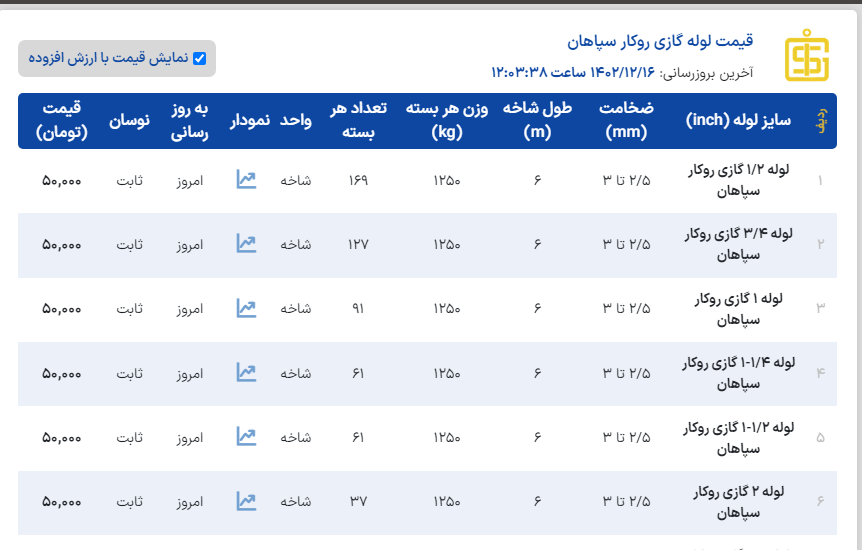 #لیست_کچو لوله گاز روکار خانگی("۳/۴و "۱/۲) ضخامت ۲/۳۵⬅️ 50500 تومان لوله گاز روکار خانگی("۱/۴-۱ و" ۱) ضخامت ۲/۸⬅️ 50500 تومان لوله گاز روکار خانگی("۳/۴و "۱/۲) ضخامت ۲/۵⬅️ 50000 تومان لوله گاز روکار خانگی("۱تا "۴) ضخامت ۳تا۴⬅️ 50000 تومان لوله گاز توکار (API) ("۴تا"۱/۲) ضخامت ۲/۶ تا ۴/۲⬅️ 51500 تومان لوله تست شده(۱/۲-۲تا" ۴) ضخامت ۳ تا ۳/۵⬅️ 47500 تومان لوله تست شده (۱/۲-۱ و" ۱/۲) ضخامت ۲/۲ تا ۲/۸⬅️ 50000 تومان 📌قیمتها با احتساب ۹٪ مالیات و فروش رسمی میباشد✅ 📞031-45400945 📞031-91013608 📲09131273851 آقای مولوی 📲09137412265 خانم صحراکار 📲09137412146 خانم امیری www.aflakahan.com @ahanmoolaviali #اعتماد_شما_آغاز_تعهد_ماست🤝