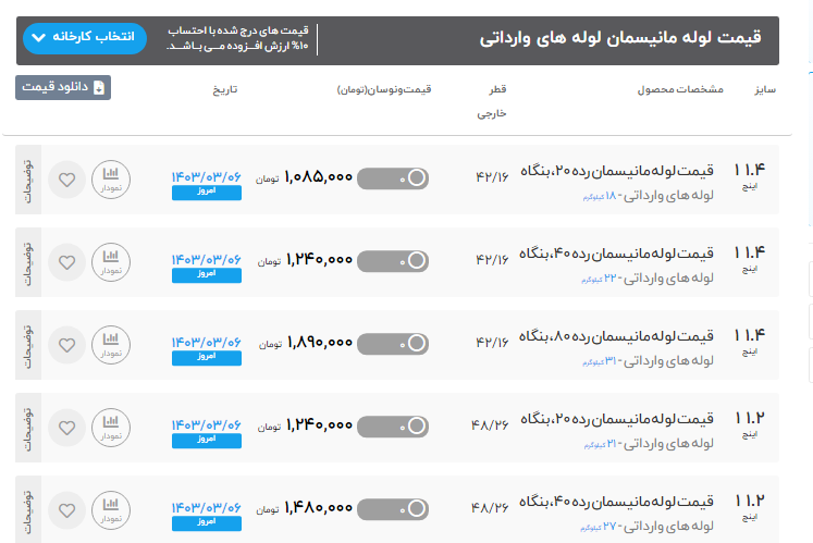 🗓یکشنبه 6 خرداد ماه 1403 #لوله_مانیسمان_وارداتی 📍بارگیری از انبار پیوان ♦️رده 20 🔹سایز 8 اینچ : 16،000،000 🔹سایز 10 اینچ : 18،000،000 🔹سایز 12 اینچ : 22،500،000 ♦️رده 40 🔸 سایز 6 اینچ : 9،200،000 🔸 سایز 8 اینچ : 19،500،000 🔸 سایز 10 اینچ : 26،500،000 🔸 سایز 12 اینچ : 35،000،000 🔸 سایز 14 اینچ : 42،000،000 #لوله #لوله_مانیسمان #لوله_و_اتصالات ⬅ (https://pivan.co/product-category/pipe/manisman-pipe/) مشاهده لیست قیمت (https://pivan.co/product-category/pipe/manisman-pipe/) ✅ثبت سفارش،مشاوره و ارتباط با کارشناسان فروش: 🌐Pivan.co ☎️021-45171 ✅کانال تلگرام https://t.me/Pivan_co
