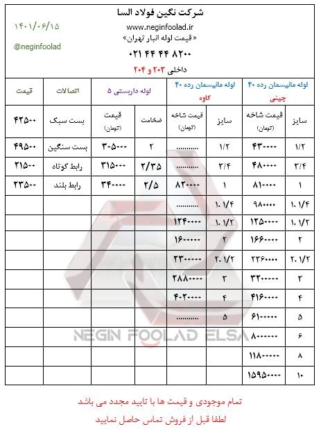 لوله استاندارد درجه 1 : لوله "6 ضخامت 6 : ⬅️ 24400 تومان لوله "8 ضخامت 6 : ⬅️ 24400 تومان لوله "10 ضخامت 6 : ⬅️ 24400تومان لوله "12 ضخامت 6 : ⬅️ 24300 تومان لوله "12 ضخامت 8 : ⬅️ 25400 تومان لوله "12 ضخامت 10: ⬅️ 24500تومان لوله "14 ضخامت 6 : ⬅️ 24300 تومان لوله "14 ضخامت 8: ⬅️ 24400 تومان لوله "14 ضخامت 10:⬅️ 24500 تومان ⭕️ قيمت ها با احتساب ٩٪ماليات و فروش به صورت رسمي ميباشد ⭕️
