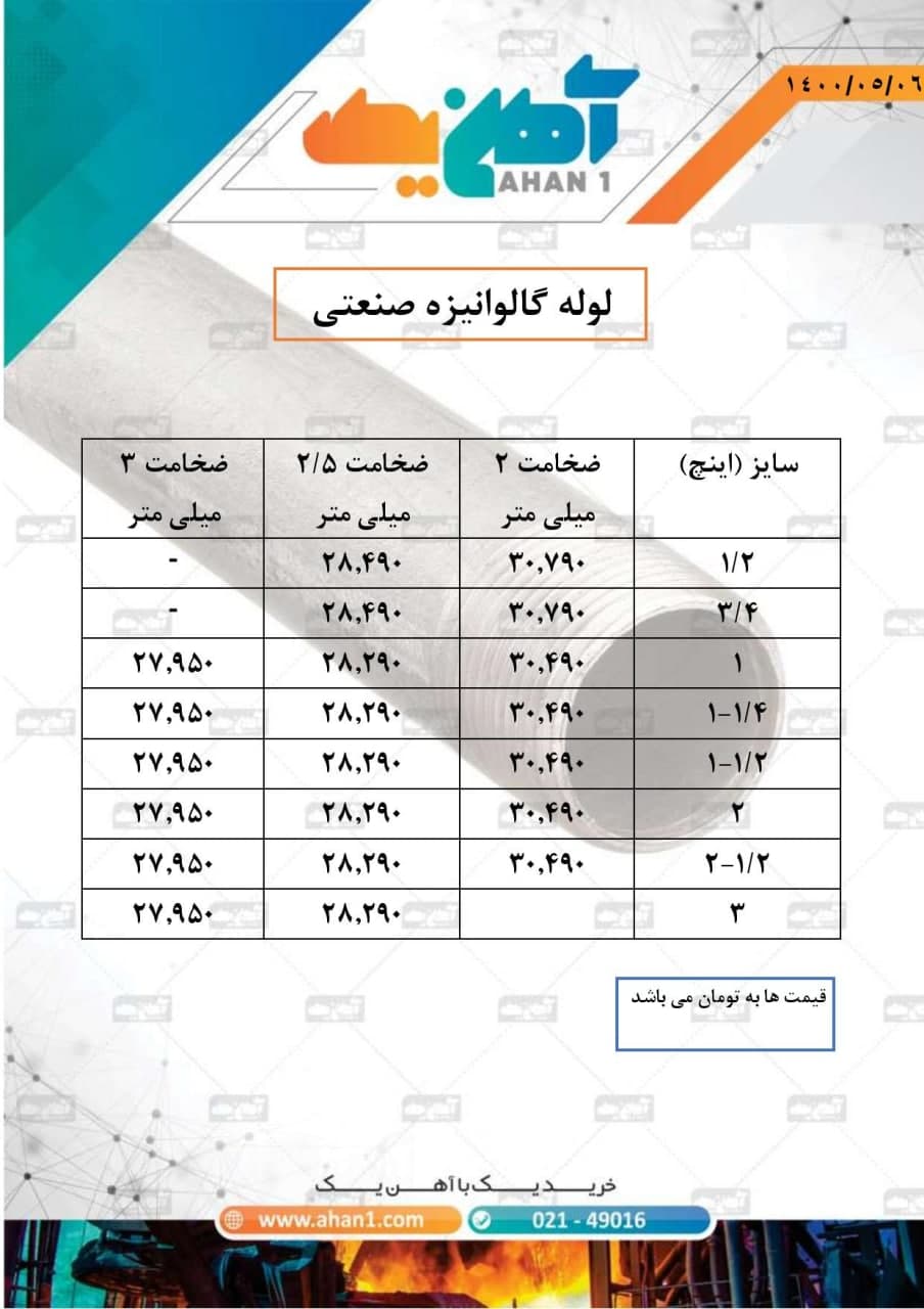 #لوله_داربستی کارخانه جهان 🗓 چهارشنبه 6 مرداد ماه 1400 🗓 ضخامت 2 : 25900 ضخامت 2.5 میل : 24900 📌ارتباط با کارشناسان فروش :👇🏻 ☎️ 021-54103