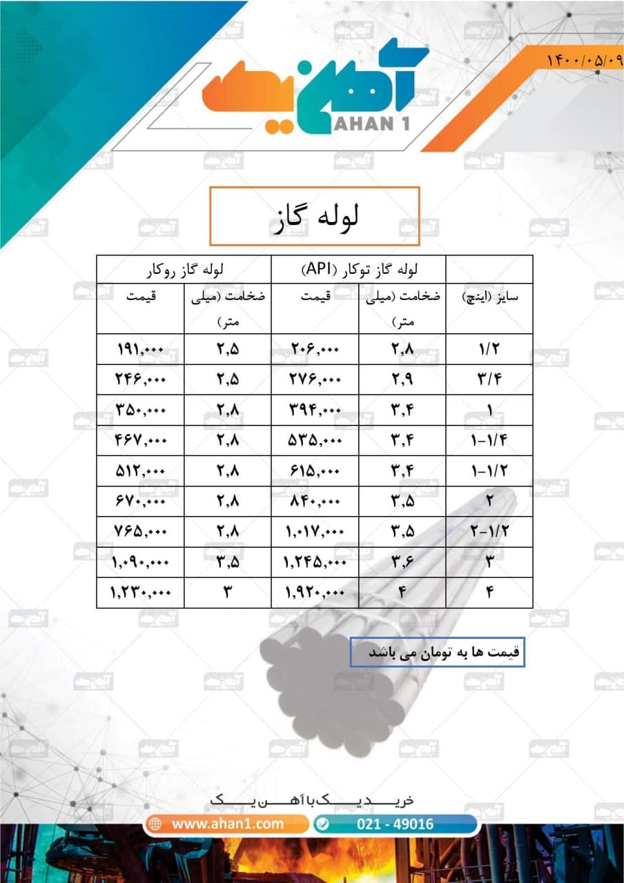 #لوله_گاز #اصفهان #لوله_گاز_روکار روکار ۱/۲ اینچ ــــــــــ ۲۶۶،۵۰۰ روکار ۳/۴ اینچ ـــــــــــ ۲۶۶،۵۰۰ روکار ۱ اینچ ـــــــــــــــ ۲۶۶،۵۰۰ روکار ۱/۴ ۱ اینچ ـــــــــ ۲۶۶،۵۰۰ روکار ۱/۲ ۱ اینچ ـــــــــ ۲۶۶،۵۰۰ روکار ۲ اینچ ـــــــــــ ۲۶۶،۵۰۰ ✅کارخانه ✅۶متری 📞۱۸۳۶ 📞 ۰۲۱۶۶۹۱۱۰۰۷ داخلی (۷۰۵)
