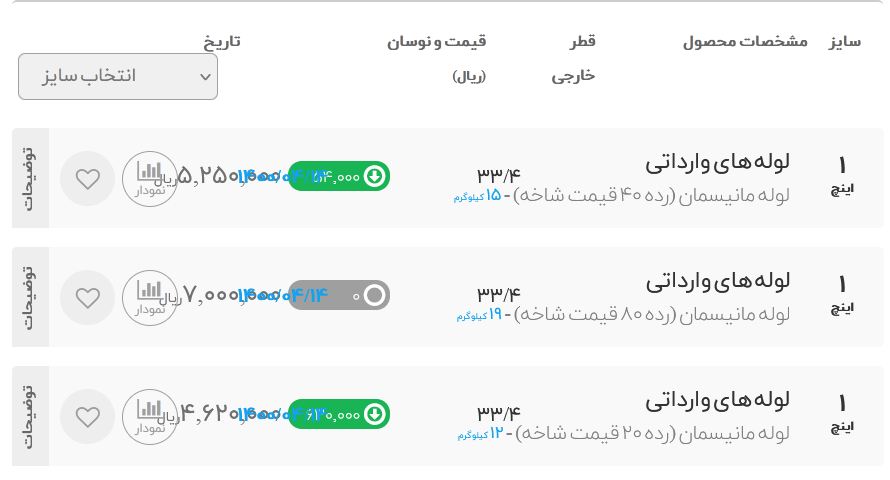 لوله ۴ اینچ (لوله ۱۱۴-لوله۱۱)ض۲ لوله داربستی ض۲ لوله داربستی ض۲/۵ لوله داربستی ض۳ لوله ۱/۲ ض ۲/۵ لوله ۳/۴ ض۲/۵ لوله ۳/۴ ض۲/۶۵ لوله ۳/۴ ض۲/۸ لوله ۳/۴ ض۳ ورق ۱*۲ض۲ ورق ۱۲۵۰*۲/۵ض۲ ورق ۱۲۵۰*۲/۵ ض۱/۲۵ روغنی ورق ۲/۵*۱۲۵۰ ض۲ گالوانیزه ورق ۲/۵*۱۲۵۰ ض۶۰ گالوانیزه