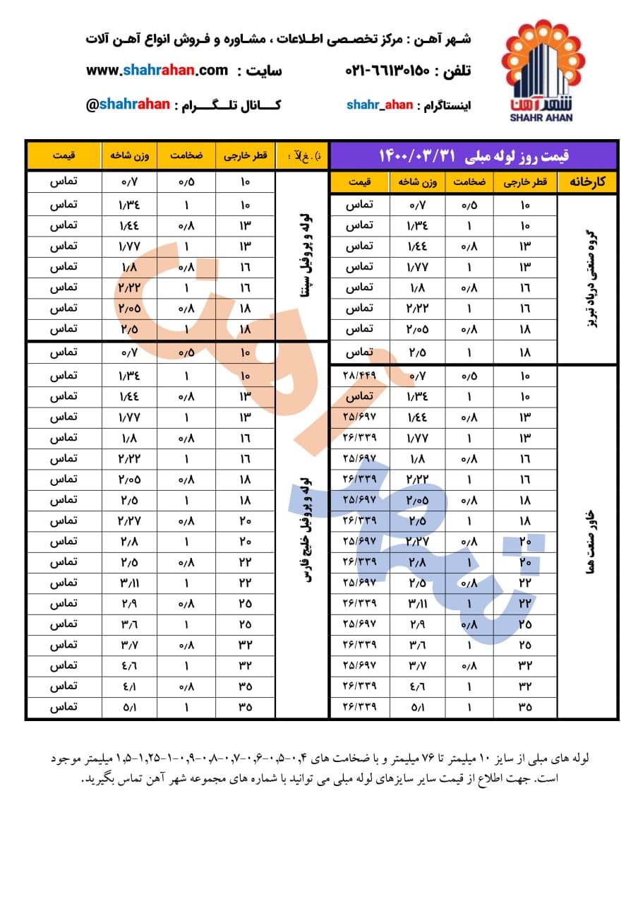 #لوله_داربستی کارخانه کیان پرشیا 🗓 یکشنبه 30 خرداد ماه 1400 🗓 کاهش 300 تومانی 🔻 ضخامت 2 میل: 24100 ضخامت 2/5 میل: 23100 📌ارتباط با کارشناسان فروش :👇🏻 ☎️ 021-54103 🌐 ahanprice.com 🆔 @ahanprice