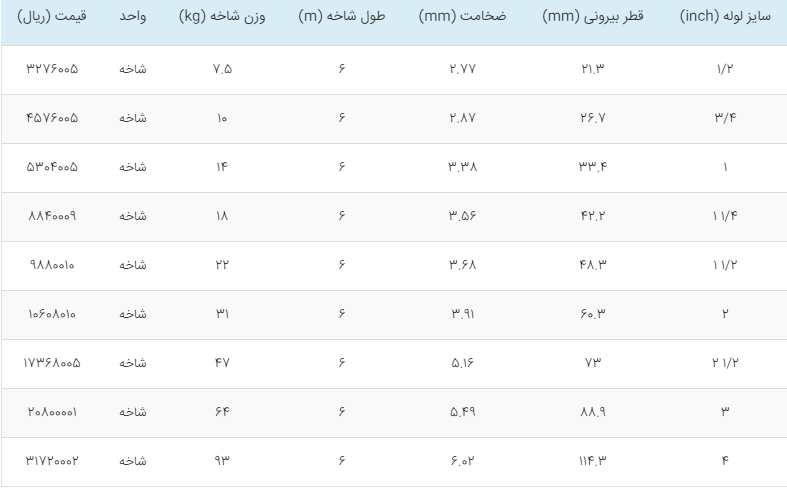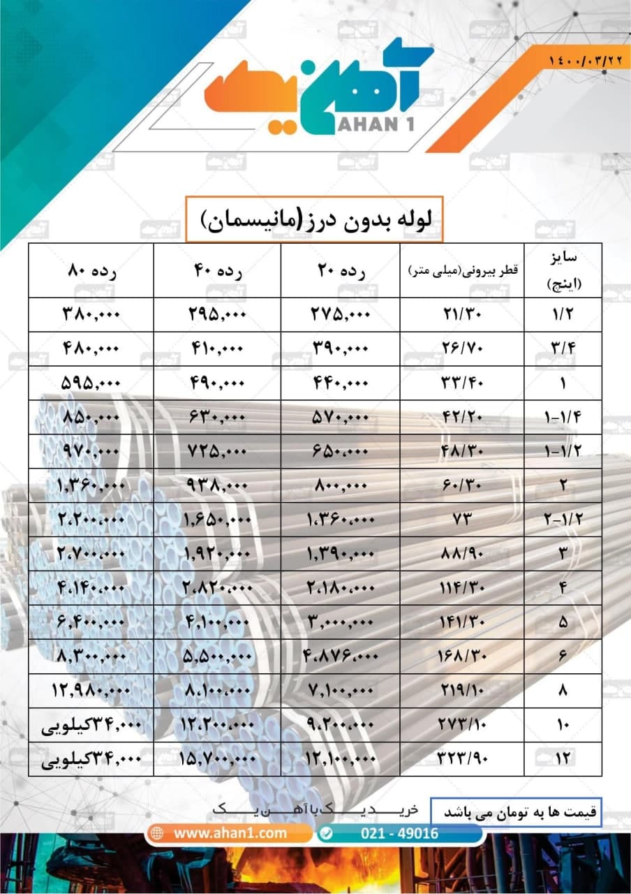🗓 یکشنبه 6 تیر ماه 1400 🗓 💠 رده 80 (قیمت شاخه)💠 1/2 اینچ با قطر خارجی 21/3 : 394.000 3/4 اینچ با قطر خارجی 26/7 : 504.400 1 اینچ با قطر خارجی 33/4 : 700.000 11/4 اینچ با قطر خارجی 42/2 :1.107.600 11/2اینج با قطر خارجی48/3 : 1.144,500 2 اینچ با قطر خارجی 60/3 : 1.590,000 21/2 اینچ با قطر خارجی 73 : 2.350,000 3 اینچ با قطر خارجی 88/9 : 2.814.000 4 اینچ با قطر خارجی114/3 : 4.599.000 🔸