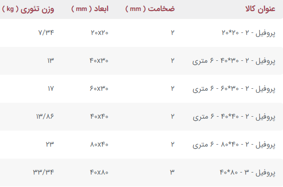 محصول قیمت قیمت (با مالیات) سه شنبه 1404/09/18 ساعت 15:00 پروفیل تهران 2*20*20 6 متری کارخانه 69,000 پروفیل تهران 2*30*30 6 متری کارخانه 69,000 پروفیل تهران 2*40*40 6 متری کارخانه 69,000 پروفیل تهران 2*50*50 6 متری کارخانه 69,000 پروفیل تهران 2*60*60 6 متری کارخانه 69,000 پروفیل تهران 2.5*40*40 6 متری کارخانه 69,000 پروفیل تهران 2.5*50*50 6 متری کارخانه 69,000 پروفیل تهران 3*70*70 6 متری کارخانه 69,000 پروفیل تهران 3*80*80 6 متری کارخانه 69,000 پروفیل تهران 3*90*90 6 متری کارخانه 69,000 پروفیل تهران 4*120*120 6 متری کارخانه 69,000 پروفیل تهران 4*140*140 6 متری کارخانه 69,000 پروفیل تهران 2*20*10 6 متری کارخانه 69,000 پروفیل تهران 2*30*20 6 متری کارخانه 69,000 پروفیل تهران 2*40*20 6 متری کارخانه 69,000 پروفیل تهران 2*80*40 6 متری کارخانه 69,000 پروفیل تهران 2*30*50 6 متری کارخانه 69,000 پروفیل تهران 2*30*60 6 متری کارخانه 69,000 پروفیل تهران 2.5*30*50 6 متری کارخانه 70,000 پروفیل تهران 2.5*30*60 6 متری کارخانه 70,000 پروفیل تهران 2.5*60*60 6 متری کارخانه 70,000 پروفیل تهران 2.5*70*70 6 متری کارخانه 70,000 پروفیل تهران 2.5*40*80 6 متری کارخانه 70,000 پروفیل تهران 2.5*80*80 6 متری کارخانه 70,000 پروفیل تهران 2.5*90*90 6 متری کارخانه 70,000 پروفیل تهران 2.5*100*100 6 متری کارخانه 70,000 پروفیل 2*20*20 6 متری اطلس فولاد مازندران کارخانه 70,000 پروفیل 2*25*25 6 متری اطلس فولاد مازندران کارخانه 70,000 پروفیل 2*30*20 6 متری اطلس فولاد مازندران کارخانه 70,000 پروفیل 2*30*30 6 متری اطلس فولاد مازندران کارخانه 70,000 پروفیل 2*20*40 6 متری اطلس فولاد مازندران کارخانه 70,000 پروفیل 2*40*40 6 متری اطلس فولاد مازندران کارخانه 70,000 پروفیل 2*30*50 6 متری اطلس فولاد مازندران کارخانه 70,000 پروفیل 2*30*60 6 متری اطلس فولاد مازندران کارخانه 70,000 پروفیل 2*60*60 6 متری اطلس فولاد مازندران کارخانه 70,000 پروفیل 2*70*70 6 متری اطلس فولاد مازندران کارخانه 70,000 پروفیل 2*80*40 6 متری اطلس فولاد مازندران کارخانه 70,000 پروفیل 2*90*90 6 متری اطلس فولاد مازندران کارخانه 70,000 پروفیل 2*100*40 6 متری اطلس فولاد مازندران کارخانه 70,000 پروفیل صنعتی 5*60*60 6 متری کارخانه 77,000 پروفیل صنعتی 5*70*70 6 متری کارخانه 77,000 پروفیل صنعتی 5*80*80 6 متری کارخانه 77,000 پروفیل صنعتی 5*90*90 6 متری کارخانه 77,000 پروفیل صنعتی 5*100*100 6 متری کارخانه 77,000 پروفیل صنعتی 6*70*70 6 متری کارخانه 77,000 پروفیل صنعتی 6*80*80 6 متری کارخانه 77,000 پروفیل صنعتی 6*90*90 6 متری کارخانه 77,000 پروفیل صنعتی 12*300*300 12 متری کارخانه 77,000 پروفیل صنعتی 14*300*300 12 متری کارخانه 77,000 پروفیل صنعتی 16*300*300 12 متری کارخانه 77,000 پروفیل 2*20*20 6 متری اصفهان 70,000 پروفیل 2*30*30 6 متری اصفهان 70,000 پروفیل 2*40*40 6 متری اصفهان 70,000 پروفیل 2*60*40 6 متری اصفهان 70,000 پروفیل 2*40*80 6 متری اصفهان 70,000 پروفیل 2.5*20*20 6 متری اصفهان 70,000 پروفیل 2.5*30*30 6 متری اصفهان 70,000 پروفیل 2.5*30*50 6 متری اصفهان 70,000 پروفیل 2.5*50*50 6 متری اصفهان 70,000 پروفیل 2.5*60*60 6 متری اصفهان 70,000 پروفیل 3*40*40 6 متری اصفهان 70,000 پروفیل 3*70*70 6 متری اصفهان 70,000 پروفیل 3*80*80 6 متری اصفهان 70,000 پروفیل 3*90*90 6 متری اصفهان 70,000 پروفیل 3*100*100 6 متری اصفهان 70,000 پروفیل 3*135*135 6 متری اصفهان 70,000 پروفیل 4*40*40 6 متری اصفهان 70,000 پروفیل 4*50*50 6 متری اصفهان 70,000 پروفیل 4*60*60 6 متری اصفهان 70,000 پروفیل 4*90*90 6 متری اصفهان 70,000 پروفیل 4*120*120 6 متری اصفهان 70,000 پروفیل 4*135*135 6 متری اصفهان 70,000 نبشی 3*30*30 شکفته 6 متری کارخانه 48,200 نبشی 3*30*30 شکفته 6 متری بنگاه تهران 48,800 نبشی 4*40*40 شکفته 6 متری کارخانه 48,000 نبشی 4*40*40 شکفته 6 متری بنگاه تهران 48,900 نبشی 5*50*50 شکفته 6 متری کارخانه 48,100 نبشی 5*50*50 شکفته 6 متری بنگاه تهران 48,200 نبشی 6*60*60 شکفته 6 متری کارخانه 47,800 نبشی 6*60*60 شکفته 6 متری بنگاه تهران 48,100 نبشی 8*80*80 شکفته 6 متری کارخانه 47,800 نبشی 8*80*80 شکفته 6 متری بنگاه تهران 48,200 نبشی 10*100*100 شکفته 6 متری کارخانه 47,800 نبشی 10*100*100 شکفته 6 متری بنگاه تهران 48,100 نبشی 3*40*40 آریان فولاد 6 متری کارخانه 48,100 نبشی 4*40*40 آریان فولاد 6 متری کارخانه 48,100 نبشی 4*40*40 آریان فولاد 6 متری بنگاه تهران 48,100 نبشی 5*50*50 آریان فولاد 6 متری کارخانه 48,100 نبشی 5*50*50 آریان فولاد 6 مت