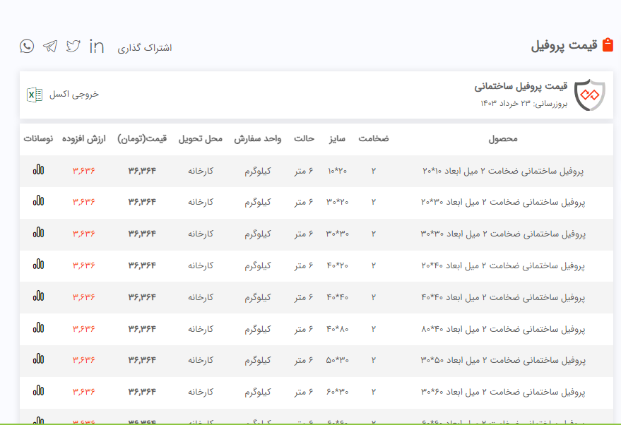 🟠 شرکت #پارس_مواد_نقش_جهان 🔥میلگرد _ ذوب آهن آرمان آسیا 🟠میلگرد A2 سایز 10 274 هزار ریال 🟠میلگرد A3 سایز 12 275 هزار ریال 🟠میلگرد A3 سایز 16 266 هزار ریال 🟠میلگرد A3 سایز 18 266 هزار ریال 🔥نبشی _ آرین فولاد قزوین 🟠نبشی 4 گوشت 3 285 هزار و 500 ریال 🟠نبشی 4 گوشت 4 277 هزار ریال 🟠نبشی 7 284 هزار ریال 🟠نبشی 5-6-8 276 هزار ریال 🟠نبشی 10 283 هزار ریال 🟠نبشی 12 283 هزار ریال 🔥ورق سیاه _ فولاد مبارکه 🟠انبار تهران/ اصفهان 🔹ورق 3 میل 1500*6000 🔹ورق 4 میل 1500*6000 🔹ورق 5 میل 1500*6000 🔹ورق 6 میل 1500*6000 🔹ورق 8 میل 1500*6000 🔹ورق 10 میل 1500*6000 🔹ورق 12 میل 1500*6000 🔹ورق 15 میل 1500*6000 🔥سپری آهنی 🔵سپری آهنی 4 طول 6 متر فابریک (سبک) 307 هزار ریال 🔵سپری آهنی 5 طول 6 متر فابریک (سبک) 307 هزار ریال 🔥قوطی و پروفیل 🟠ضخامت 2 سبک 397 هزار ریال 🟠ضخامت 2.5 393 هزار ریال #جهت_مشاهده_پروفایل_پارس_مواد_نقش_جهان https://foolad24.com/profile/17737 #جهت_مشاهده_اعلام_موجودی_پارس_مواد_نقش_جهان https://foolad24.com/profile/17737/inventory 📌 تامین کننده انواع مقاطع فولادی( میلگرد، نبشی، تیرآهن، ناودانی، لوله، ورق و ...) 📎 اطلاعات تماس: 📞 031-35058 🌐 parsferro.com ✉️ info@parsferro.com 🆔 @parsferro 🧭 اصفهان، خیابان مصلی شمالی(آب ۲۵۰)، ساختمان هدی، طبقه دوم، واحد ۸