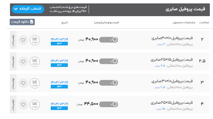 📅 تاریخ: 1403/03/16 📍تحویل: #کارخانه_اصفهان #پروفیل_اصفهان 🔹ضخامت 2 میل : 400000 🔹ضخامت 2.5 میل : 400000 🔹ضخامت 3 میل : 405000 🔹ضخامت 4 میل : 405000 🔹ضخامت 5 میل : 430000 🔹ضخامت 6 میل : 440000 🔹ضخامت 8 میل : ———- ☎️ 1836 ☎️ 021 - 6299 9080 📞 (داخلی 405 _ 410) ⭐️راحت بخرید، مطمئن بسازید @Mahdefoolad