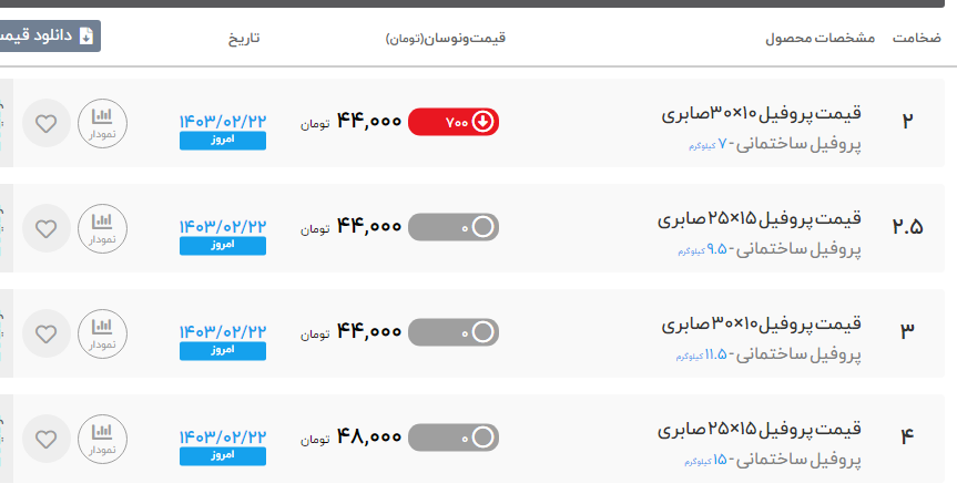 📌 پروفیل سبک 435,000 📌پروفیل سنگین 430,000 📌 ستونی 430,000 📌ناودانی۸و۱۰ سبک 295,000 📌ناودانی۸تا۱۶سنگین 295,000 📌نبشی۳-۳میل ____ 📌نبشی ۳-۴ میل ____ 📌نبشی۴-۳میل 295,000 📌نبشی۴-۴میل 290,000 📌نبشی۵-۵/۴میل 280,000 📌نبشی۶-۵/۶میل 280,000 📌نبشی۸-۸میل 280,000 📌نبشی۱۰-۱۰میل 290,000 ✅ انبار اصفهان؛بارگیری سریع ☎️ 031-4202