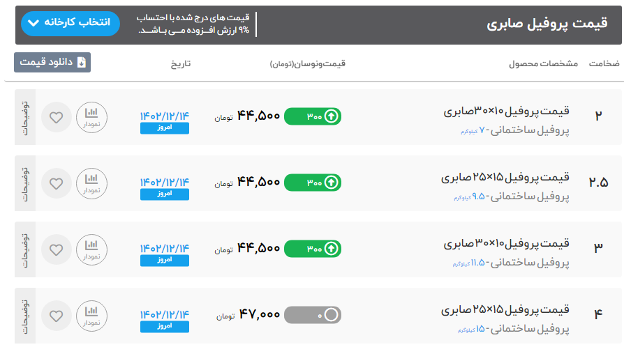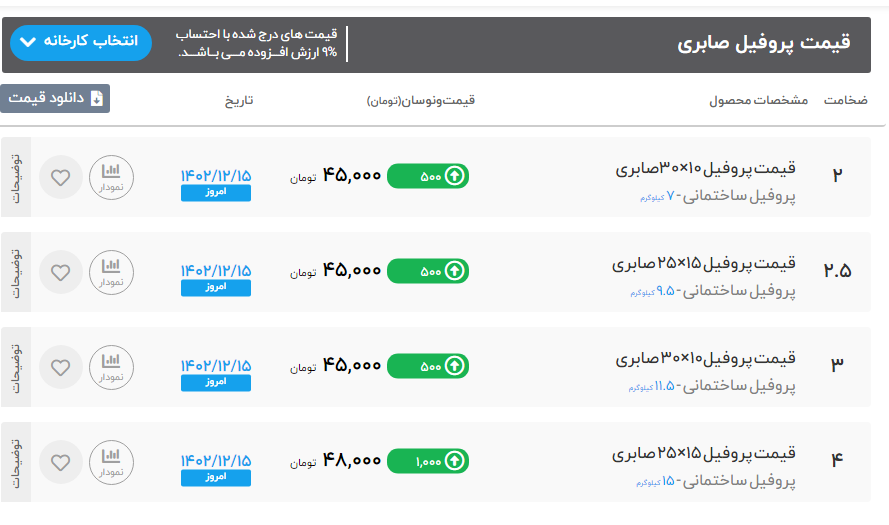 #قیمت #پروفیل #تهران_صدرا 🌎 دوشنبه 14 اسفند ماه 1402 🌎 قوطی و پروفیل ضخامت 2 ⏪ 438000 ریال قوطی و پروفیل ضخامت 2.5 ⏪ 432000 ریال قوطی و پروفیل ضخامت 3 ⏪ 432000 ریال قوطی و پروفیل ضخامت 4 ⏪ 432000 ریال ✅تهران آهن خریدی امن,آسان,ارزان ✅کارشناس فروش :خانم رضایی 🔴 لیست کامل قیمت پروفیل 🔴 ⚙️برای مشاهده کامل جدول قیمت پروفیل می توانید به سایت تهران آهن مراجعه کنید: ✅ (50 خط ویژه): ☎️021-86073000 📱 instagram.com/tehran.ahan 🌏 https://b2n.ir/x13009 🔗 t.me/Tehran_ahan