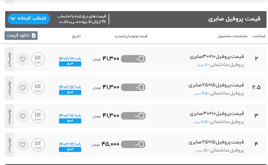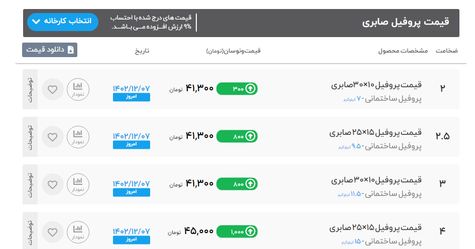 #قیمت #پروفیل #صابری 🌎 سه شنبه 08 اسفند ماه 1402 🌎 قوطی و پروفیل ضخامت 2 ⏪ 417000 ریال قوطی و پروفیل ضخامت 2.5 ⏪ 417000 ریال قوطی و پروفیل ضخامت 3 ⏪ 417000 ریال قوطی و پروفیل ضخامت 4 ⏪ 460000 ریال قوطی و پروفیل ضخامت 5 ⏪ 470000 ریال قوطی و پروفیل ضخامت 6 ⏪ 470000 ریال قوطی و پروفیل ضخامت 8 ⏪ 490000 ریال قوطی و پروفیل ضخامت 10 ⏪ 490000 ریال ✅تهران آهن خریدی امن,آسان,ارزان ✅کارشناس فروش :خانم رضایی 🔴 لیست کامل قیمت پروفیل 🔴 ⚙️برای مشاهده کامل جدول قیمت پروفیل می توانید به سایت تهران آهن مراجعه کنید: ✅ (50 خط ویژه): ☎️021-86073000 📱 instagram.com/tehran.ahan 🌏 https://b2n.ir/x13009 🔗 t.me/Tehran_ahan