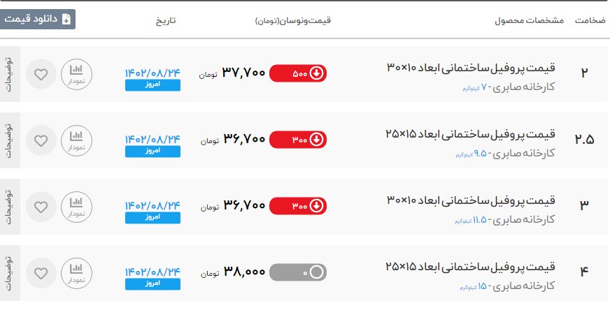 #قیمت #پروفیل #تهران_صدرا 🌎 چهارشنبه 24 آبان ماه 1402 🌎 قوطی و پروفیل ضخامت 2 ⏪ 380000 ریال قوطی و پروفیل ضخامت 2.5 ⏪ 370000 ریال قوطی و پروفیل ضخامت 3 ⏪ 360000 ریال قوطی و پروفیل ضخامت 4 ⏪ 370000 ریال ✅تهران آهن خریدی امن,آسان,ارزان ✅کارشناس فروش :خانم حمداللهی 🔴 لیست کامل قیمت پروفیل (https://tehran-ahan.com/product-category/tube/?utm_source=telegram&utm_medium=social&utm_campaign=gheymatprofil) 🔴 ⚙️برای مشاهده کامل جدول قیمت پروفیل می توانید به سایت تهران آهن مراجعه کنید: ✅ (50 خط ویژه): ☎️021-86073000 📱 instagram.com/tehran.ahan 🌏 https://b2n.ir/x13009 🔗 t.me/Tehran_ahan