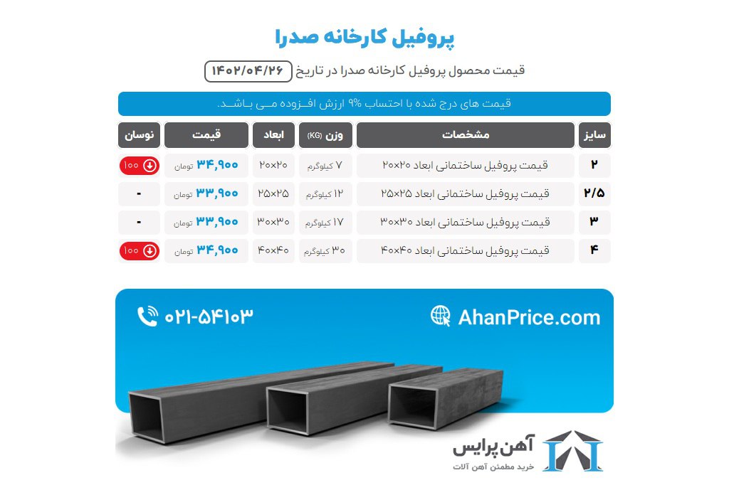 اعلام موجودی قوطی ستونی افلاک اهن #لیست_قوطی_پروفیل_فولادی_و_اهوازیپروفیل ضخامت 2 فولادی ⬅️ 34000 تومان پروفیل ضخامت 2 اهوازی ⬅️ 33500 تومان پروفیل ضخامت 2/5 اهوازی ⬅️ 32500 تومان پروفیل ضخامت 3و4 اهوازی ⬅️ 32500 تومانستونی 3-4 میل ⬅️ 32200 تومان