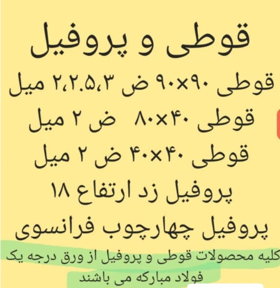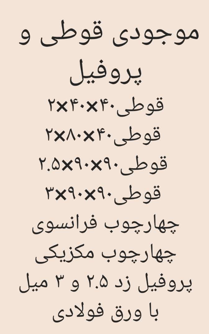 🔹قوطی سیاه مربع (2) 20*20 🔹قوطی سیاه مستطیل (2)20*30 🔹قوطی سیاه مستطیل (2)20*40 🔹قوطی سیاه مربع (2)30*30 🔹قوطی سیاه مربع (2.5)30*30 🔹قوطی سیاه مستطیل 30*40 (a2) 🔹قوطی سیاه مستطیل (2)30*50 🔹قوطی سیاه مستطیل (2.5)30*50 🔹قوطی سیاه مستطیل (2)30*60 🔹قوطی سیاه مربع (2)40*40 🔹قوطی سیاه مستطیل (2)40*60 🔹قوطی سیاه مستطیل (2)40*80 🔹قوطی سیاه مربع (2)90*90 🔹قوطی سیاه مربع (2.5)90*90 🔹قوطی سیاه مربع 90*90 (2.5)(a) 🔹قوطی سیاه مستطیل 40*100 (2) 🔹قوطی سیاه مستطیل 40*100 (2.2) 🔹قوطی سیاه مربع (2)60*60 🔹قوطی سیاه مربع (2)70*70 🔹پروفیل Z (2.5) 🔹پروفیل Z (3) 🔹چهارچوبی 507 (2) 🔹چهارچوبی 508 (2) 🔹چهارچوبی 509 (2) 🔹چهارچوبی 509 (2.2) 🔹لوله داربستی (2) 🔹چهارچوب فلزی فرانسوی (2) 🔹چهارچوب فرانسوی 2.2 (a) 🔹ورق سیاه 2*1000*2000 🔹ورق سیاه 2*1250*2000 🔹ورق سیاه 2*1250*2500 🔸سیم مفتولی ۱/۵ 🔸سیم مفتولی ۲/۵