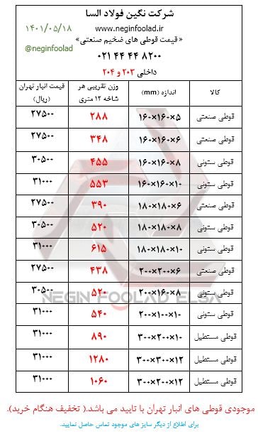 ۱۴۰۱/۰۵/۲۵ قوطی و پروفیل و لوله ۲میل مهر ۲۱۲۰۰۰ ﷼ قوطی و پروفیل و لوله ۲میل عادی ۲۰۶۰۰۰ ﷼ قوطی و پروفیل و لوله ۲/۵میل ۲۰۶۰۰۰﷼ سیم مفتول ۱/۵و۲/۵ میل ۲۳۰۰۰۰ ﷼ سیم مفتول ۳و ۴میل ۲۲۵۰۰۰ ﷼ قوطی ستونی ۲/۵و۳میل ۲۰۷۰۰۰ ﷼ قوطی ستونی ۳/۵و۴میل ۲۰۲۰۰۰﷼ ☑️ تخفیف پای معامله