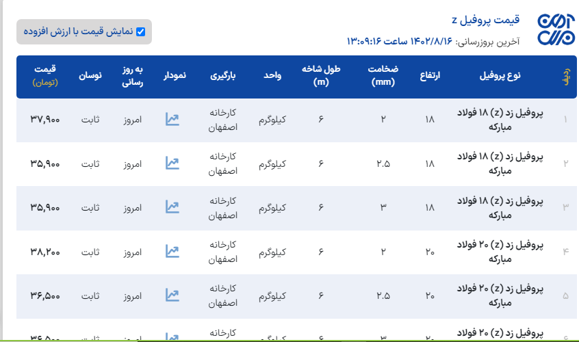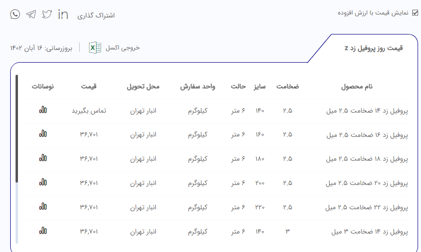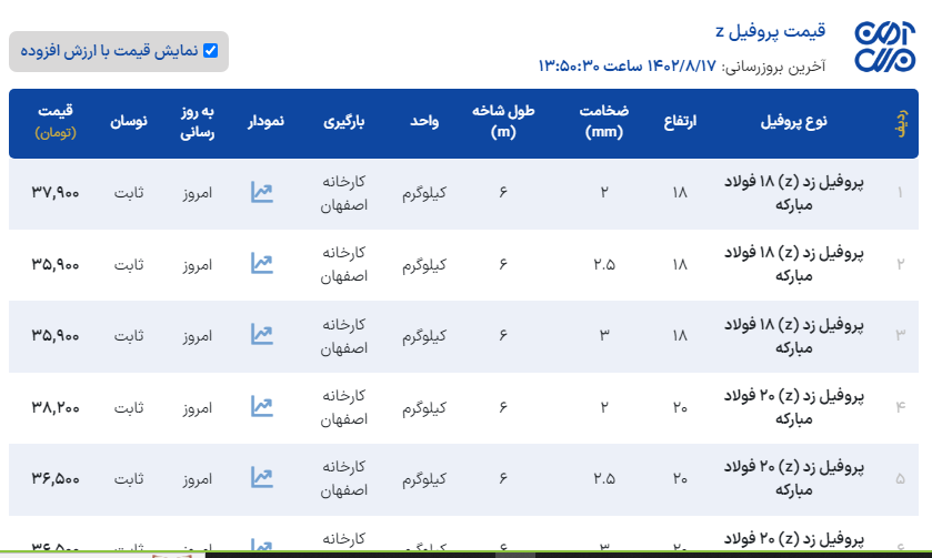 📋لیست قیمت #پروفیلZ بروزرسانی شد. 🗓 دوشنبه 15 آبان ۱۴۰۲ ⬜️پروفیل Z ضخامت ۲.۵ میل ⬛️سایز ۱۸ / قیمت: 36500 ⬛️سایز ۲۰ / قیمت: 36700 ⬛️سایز ۲۲ / قیمت: 36200 ⬜️پروفیل Z ضخامت 3 میل ⬛️سایز ۱۸ / قیمت: 36700 ⬛️سایز ۲۰ / قیمت: 36700 ⬛️سایز ۲۲ / قیمت: 36500 📊 مشاهده لیست کامل قیمت #پروفیلZ کارخانه تهران 🔗https://ahanbazar.com/product-category/profile/z-profile/ 🔶 Website: www.ahanbazar.com 🔷 Telegram : @ahanbaazar 🔴 instagram : https://instagram.com/ahanbazar ☎️ تلفن : 021 - 55445622 021 - 55445623 🔶 تهران - اتوبان آزادگان - بازار آهن مکان - خ ششم غربی - پلاک 1622 📉📈 به علت نوسانات قیمت در بازارآهن، در صورت اقدام به خرید, گرفتن تأییدیه قیمت از دفتر فروش #آهن_بازار الزامی میباشد.