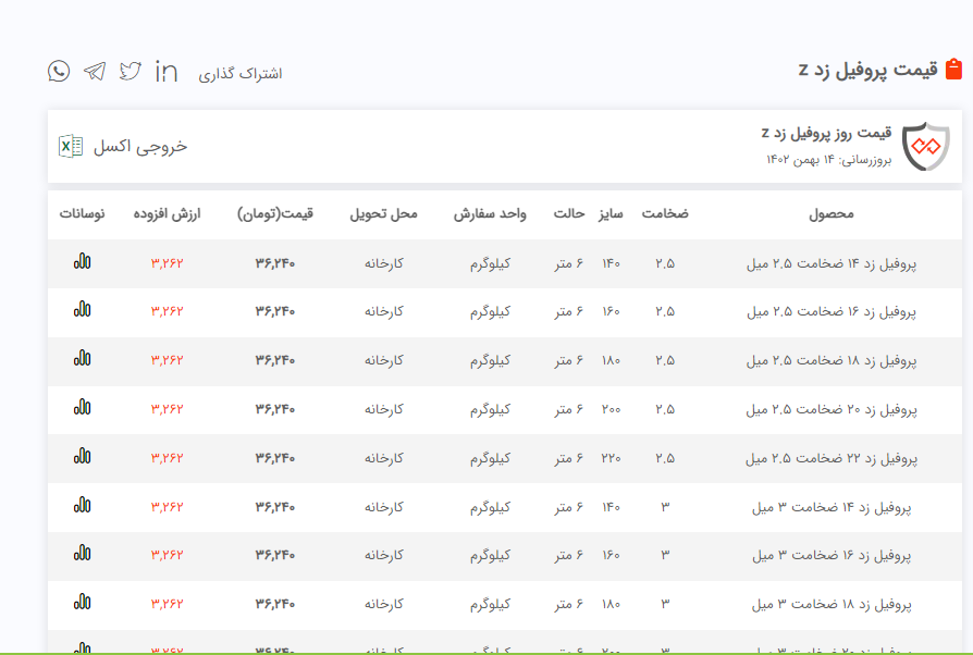 ❄️#آراد_صنعت_اسپادانا❄️ ☸️#مقاوم_پروفیل_نقش_جهان⚛️ 🟢موجودی قوطی و پروفیل🟢 ✔️قوطی ۴۰*۸۰ ضخامت ۲.۵ و ۳ ✔️قوطی ۱۰۰*۱۰۰ ضخامت ۲.۵ و ۳ و ۳.۳ ✔️قوطی ۹۰*۹۰ ضخامت ۳.۵ و ۴ ✔️قوطی ۳۰ *۵۰ ضخامت ۲ ✔️قوطی ۵۰ *۵۰ ضخامت ۲ و ۲.۳ و ۲.۵ ۳ ✔️قوطی ۴۰ *۶۰ ضخامت ۲.۵ و ۳ ✔️قوطی ۴۰*۴۰ ضخامت ۲ ✔️قوطی ۲۰*۲۰ ضخامت ۲ ✔️قوطی ۴۰*۶۰ ضخامت ۲ ✔️قوطی ۳۰*۳۰ ضخامت ۲ 🟢زد ۲میل(طبق سفارش) 🟢زد ۲.۵ میل(طبق سفارش) 🟢زد ۳ میل(طبق سفارش) 🔷پروفیل ۵۰۸ پروفیل ۵۰۹ 🟡زدبند ————————————- 🟩لوله داربستی ۲ 🟩لوله داربستی ۲.۵ 🟩لوله داربستی ۲.۵ 🟩لوله داربستی ۳ 🟩لوله داربستی ۳.۲ 🟩لوله داربستی ۳.۵ ✅با ورق فولادمبارکه✅ #جهت_مشاهده_پروفایل_آراد_صنعت_اسپادانا https://foolad24.com/profile/638 #جهت_مشاهده_اعلام_موجودی_آراد_صنعت_اسپادانا https://foolad24.com/profile/638/inventory 📌https://t.me/gozareshgarfoolad24 👈🏻 لینک کانال خبری فولاد 24 ⚜️برای کسب اطلاعات بیشتر با شماره های زیر تماس بگیرید : 031-42998 09101194070 09134004070 09131124070 👈🏻راه های ارتباطی با ما : https://t.me/aradsanat4070