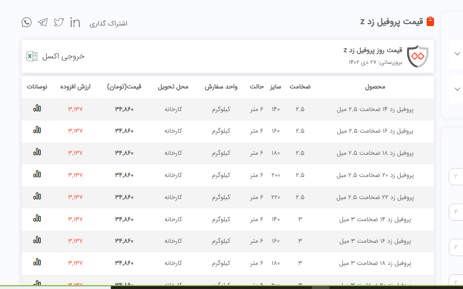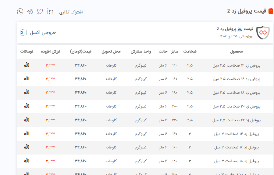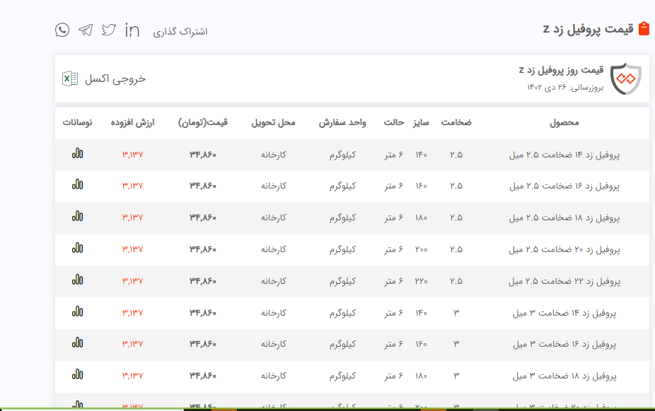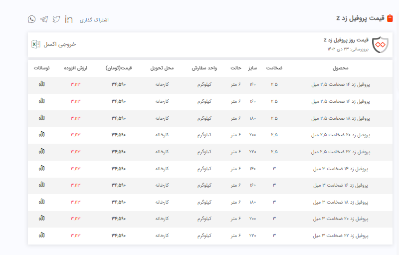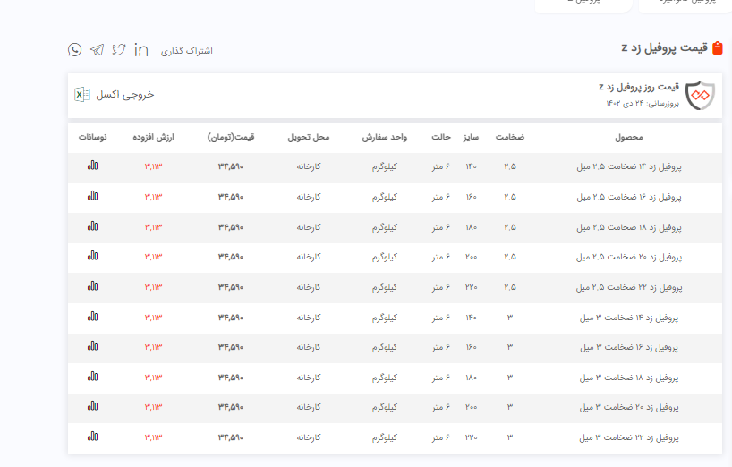 ⭕️#آراد_صنعت_اسپادانا⭕️ ⭕️#مقاوم_پروفیل_نقش_جهان⭕️ 🟢موجودی قوطی و پروفیل🟢 ✔️قوطی ۱۳*۱۳ ضخامت ۴ ✔️قوطی ۱۰۰*۱۰۰ ضخامت ۲.۵ و ۳ و ۳.۳ ✔️قوطی ۹۰*۹۰ ضخامت ۲.۵ و ۳ و ۳.۵ و ۴ ✔️قوطی ۳۰ *۵۰ ضخامت ۲ ✔️قوطی ۵۰ *۵۰ ضخامت ۲ و ۲.۳ و ۲.۵ ۳ ✔️قوطی ۴۰ *۶۰ ضخامت ۲.۵ و ۳ ✔️قوطی ۴۰*۴۰ ضخامت ۲ ✔️قوطی ۲۰*۲۰ ضخامت ۲ 🟢زد ۲میل(طبق سفارش) 🟢زد ۲.۵ میل(طبق سفارش) 🟢زد ۳ میل(طبق سفارش) 🟩لوله داربستی ۲ 🟩لوله داربستی ۲.۵ 🟩لوله داربستی ۳ 🔷پروفیل ۵۰۸ 🟡زدبند ————————————- خدمات برش ورق از ۲ تا ۲۵ میل✏️ 🟡 CNC🟡 ✅پانچ ورق✅ ✔️خدمات خم ورق از ۲ میل تا ۱۵ میل #جهت_مشاهده_پروفایل_آراد_صنعت_اسپادانا https://foolad24.com/profile/638 #جهت_مشاهده_اعلام_موجودی_آراد_صنعت_اسپادانا https://foolad24.com/profile/638/inventory 📌https://t.me/gozareshgarfoolad24 👈🏻 لینک کانال خبری فولاد 24 ⚜️برای کسب اطلاعات بیشتر با شماره های زیر تماس بگیرید : 031-42998 09101194070 09134004070 09131124070 👈🏻راه های ارتباطی با ما : https://t.me/aradsanat4070