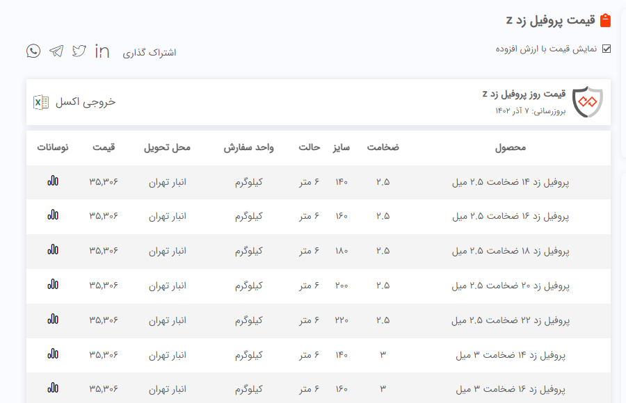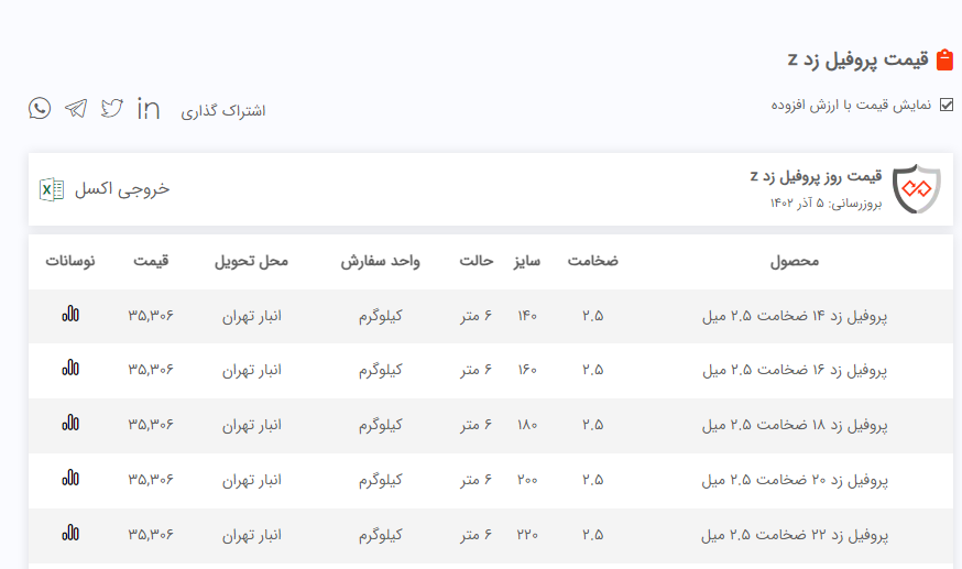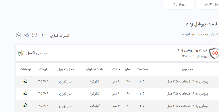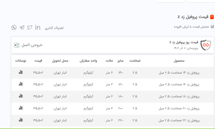 📋لیست قیمت #پروفیلZ بروزرسانی شد. 🗓 دوشنبه 6 آذر ۱۴۰۲ ⬜️پروفیل Z ضخامت ۲.۵ میل ⬛️سایز ۱۸ / قیمت: 34300 ⬛️سایز ۲۰ / قیمت: 34500 ⬛️سایز ۲۲ / قیمت: 34500 ⬜️پروفیل Z ضخامت 3 میل ⬛️سایز ۱۸ / قیمت: 34300 ⬛️سایز ۲۰ / قیمت: 34500 ⬛️سایز ۲۲ / قیمت: 34500 📊 مشاهده لیست کامل قیمت #پروفیلZ کارخانه تهران 🔗https://ahanbazar.com/product-category/profile/z-profile/ 🔶 Website: www.ahanbazar.com 🔷 Telegram : @ahanbaazar 🔴 instagram : https://instagram.com/ahanbazar ☎️ تلفن : 021 - 55445622 021 - 55445623 🔶 تهران - اتوبان آزادگان - بازار آهن مکان - خ ششم غربی - پلاک 1622 📉📈 به علت نوسانات قیمت در بازارآهن، در صورت اقدام به خرید, گرفتن تأییدیه قیمت از دفتر فروش #آهن_بازار الزامی میباشد.
